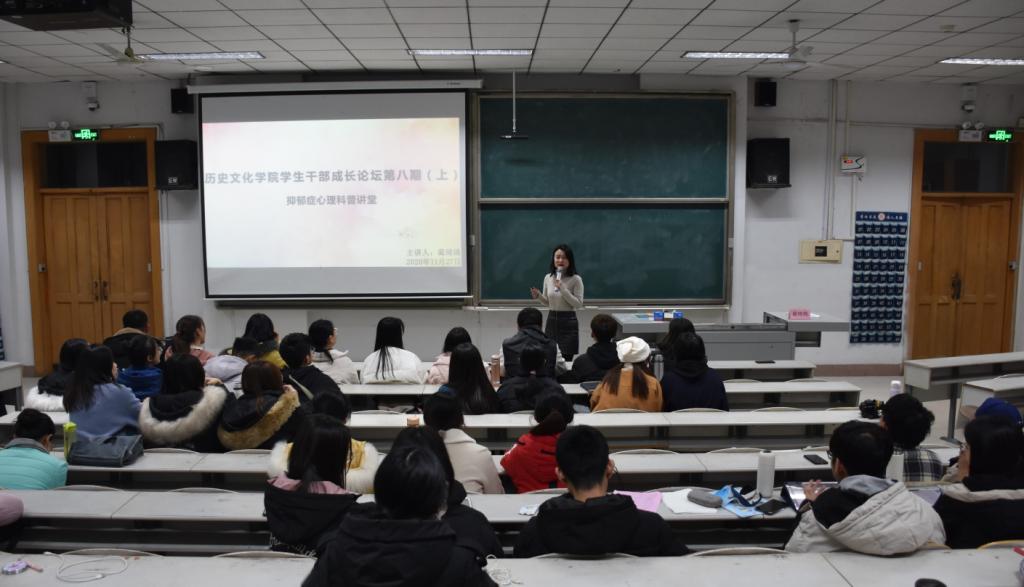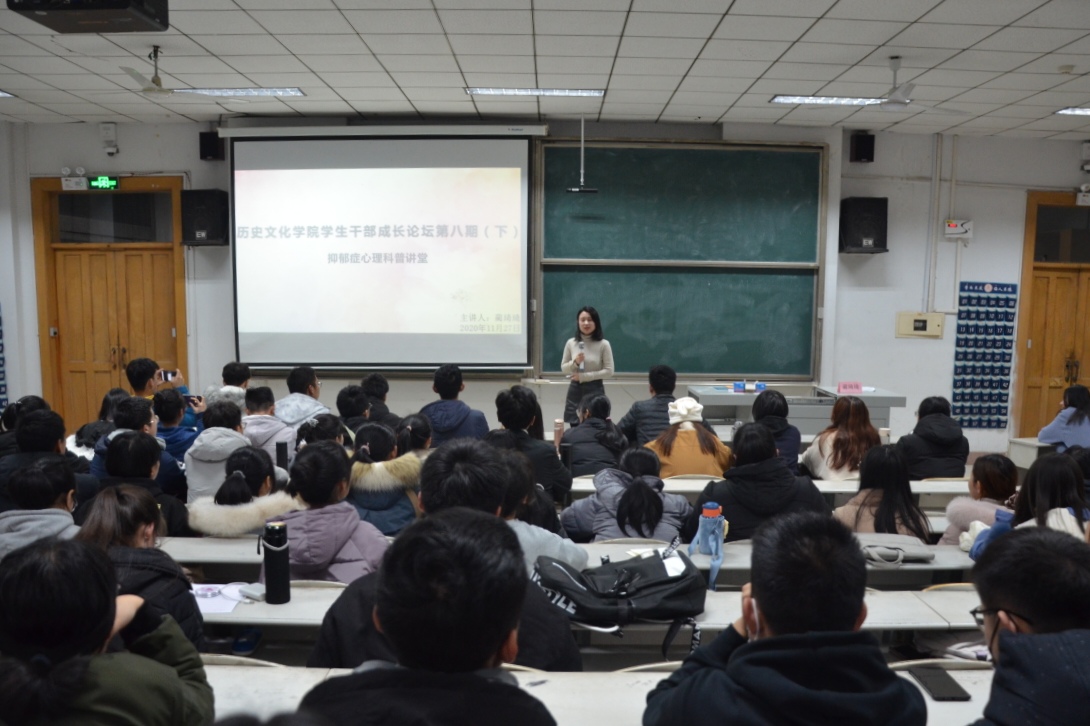 11月27日晚,正妹av 举办2020年第八期学生干部成长论坛之抑郁症心理科普讲堂。论坛邀请2018级辅导员蔺琦琦作为主讲人。正妹av 各班的心理委员、班长、团支书、副班长、副团支书以及各宿舍的宿舍心理信息员参加会议。 会上,蔺琦琦从心理信息员的角色定位、大学生常见心理问题成因和如何识别心理问题三个问题展开。同时,蔺琦琦向同学们科普抑郁症知识,并针对大一到大四同学普遍出现的心理问题,提出了解决建议。 抑郁症心理科普讲堂的举办,向同学们普及了抑郁症的相关知识,帮助同学们科学地认识抑郁症,走出认知误区,有利于增强大学生自我心理保健意识,营造了关注心理健康、了解心理健康、重视心理健康的良好氛围。