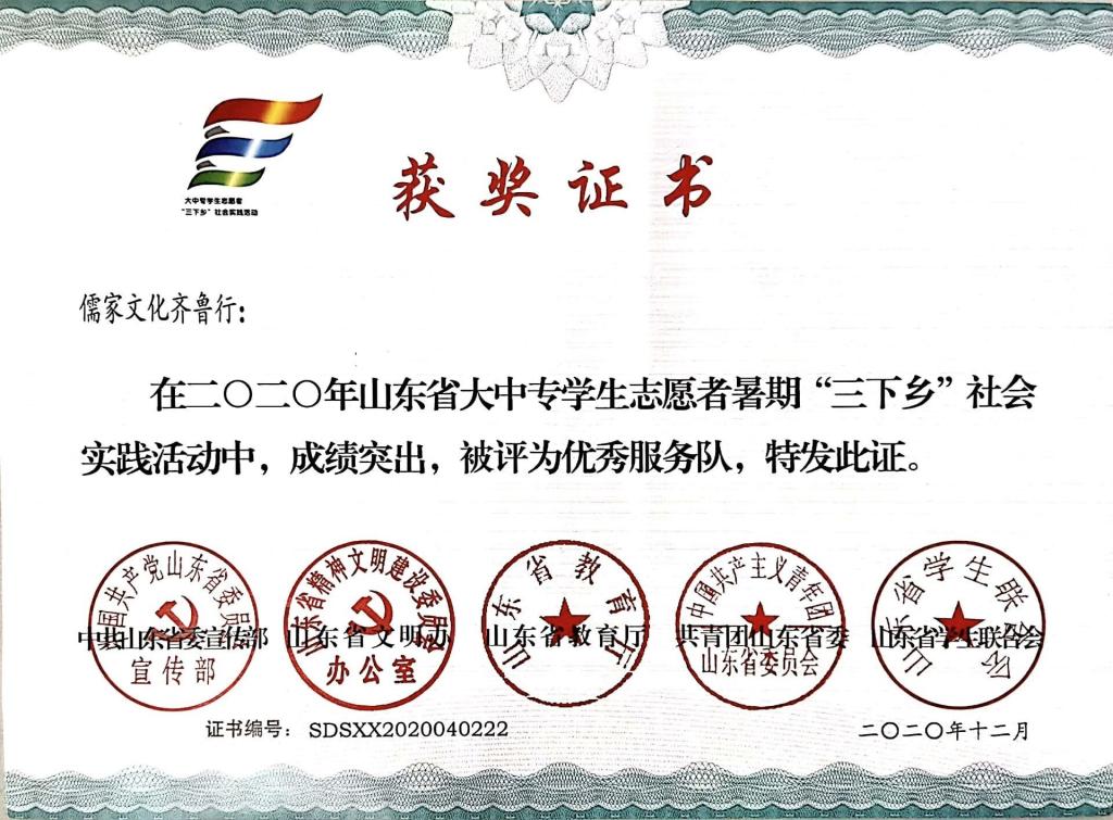 正妹av 师生在活动中取得佳绩,正妹av ““儒家文化齐鲁行”暑期社会实践被评为“优秀服务队”,正妹av 王建阳老师、刘贤贤老师、刘瑞昕老师被评为“优秀指导教师,张润泽、张晓帆、刘学栋、王宁、王颖、王梓潇同学被评为“优秀学生”。