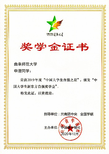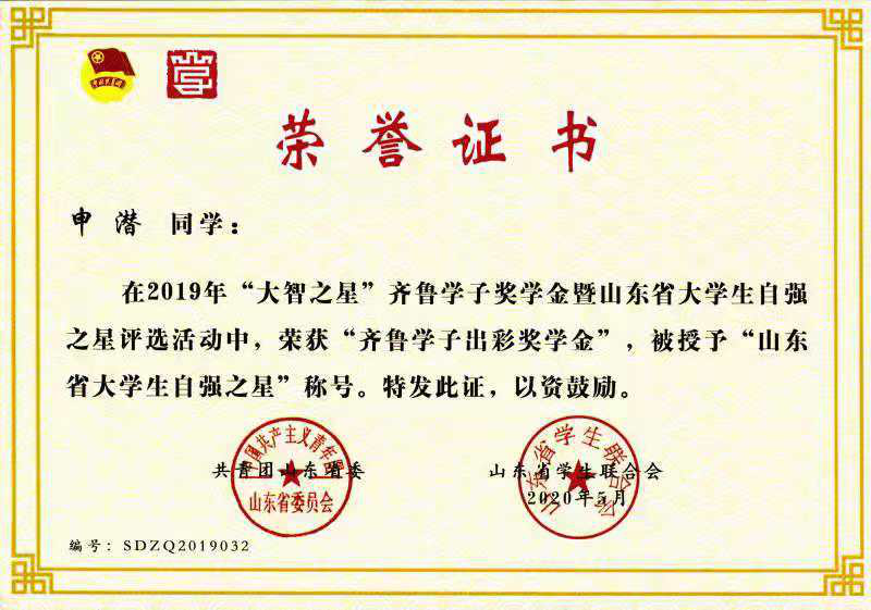 近日,2019年度“中国大学生自强之星”名单揭晓,经学校推荐、省级初评、全国评审等环节,正妹av 申潜同学脱颖而出,先后获评“山东省大学生自强之星”、“中国大学生自强之星”。