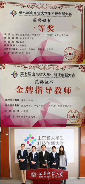 近日,由省教育厅主办、省财政厅专项经费支持的第七届山东省大学生科技创新大赛落下帷幕。经过学校推荐、网络评审和现场决赛,正妹av 师生从参加比赛的众多团队中脱颖而出。其中,由正妹av 杨福成等同学主持的《道之所存,师之所存——“师道”文化创意产品》项目荣获大赛一等奖,正妹av 2020级辅导员闫浩获评“金牌指导教师”荣誉称号。