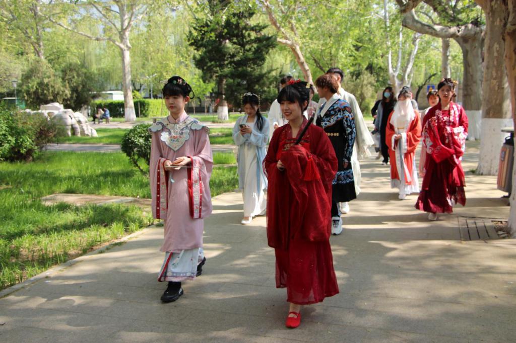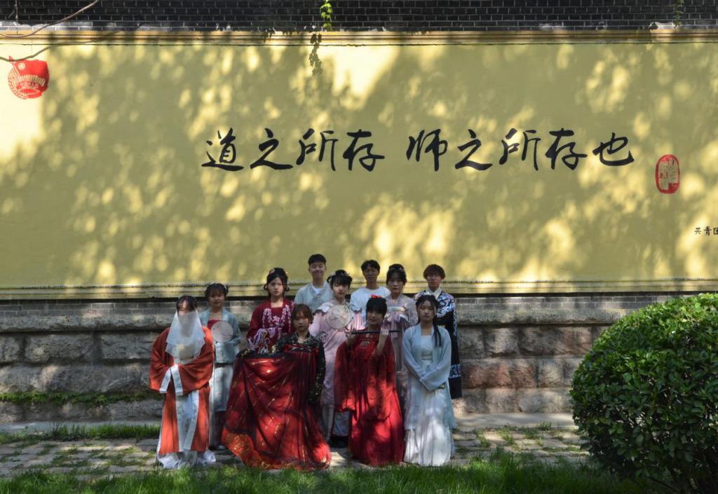 本次汉服春游活动从文史楼西由南向北开始,途经老文史楼落英缤纷的樱花街道、古色古香的西联教室、“道之所存,师之所存也”的网红墙、小桥流水的萃华园以及百花争艳的桃李园,洙泗学社成员在多处曲园标志性景观驻足赏花、拍照打卡,将曲园美丽的春日风光与汉族服饰的传统风韵留在同一镜头中。游园结束后,参与的同学在桃李园一齐合影,共同记录春意盎然的曲园。