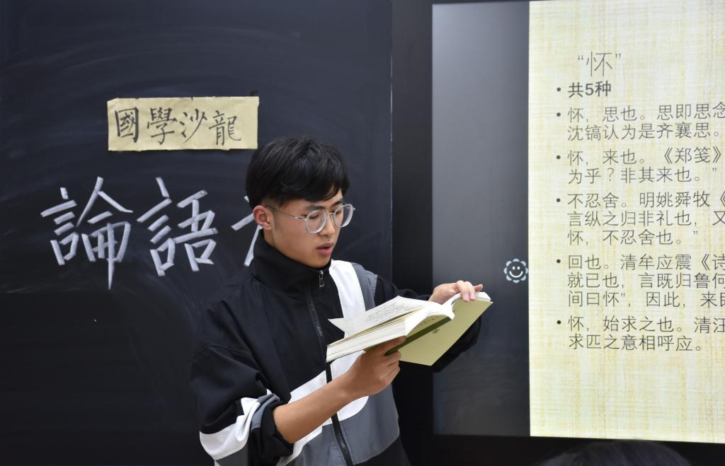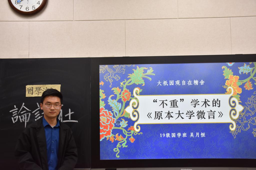 在此次国学沙龙活动上,焦睿韬、孙迪、吴月恒3位同学依次发表读书报告。他们立足传统国学文化、结合近代转型前著名思想家们的智慧结晶、通过书法展示、视频演播、讲述通俗故事等方式分别讲述了“君权从何而来?对《论语·尧曰篇二十》的猜想”、“《诗经·齐风·南山》概说”、“‘不重’学术的《原本大学微言》”课题。