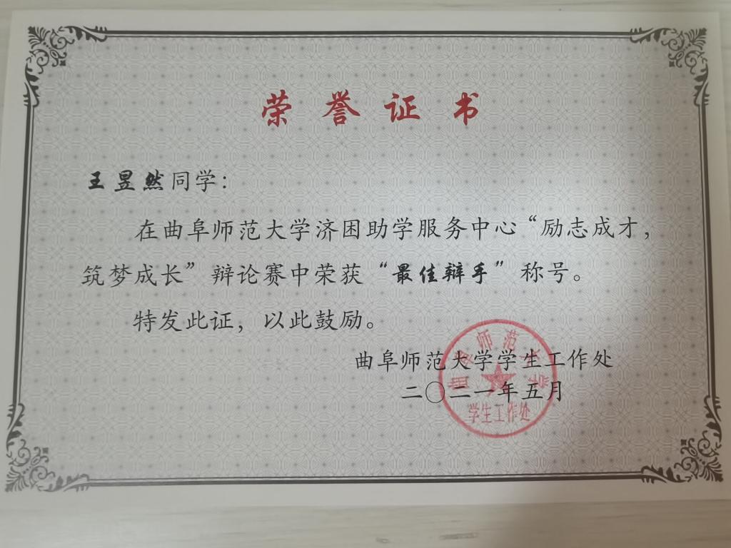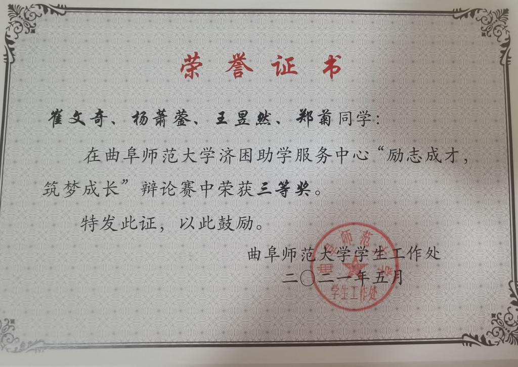 近日,由济困助学服务中心开展的“励志成才,助梦成长”辩论赛活动圆满结束。正妹av 学子积极参与并取得优异成绩,崔文奇、杨萧蓥、王昱然、郑菊同学荣获三等奖,平均得分90分,其中王昱然同学以93.5分获得最佳辩手称号;邱宝莹、杨丽君、赵悦彤、南飞宇同学获得优秀奖。