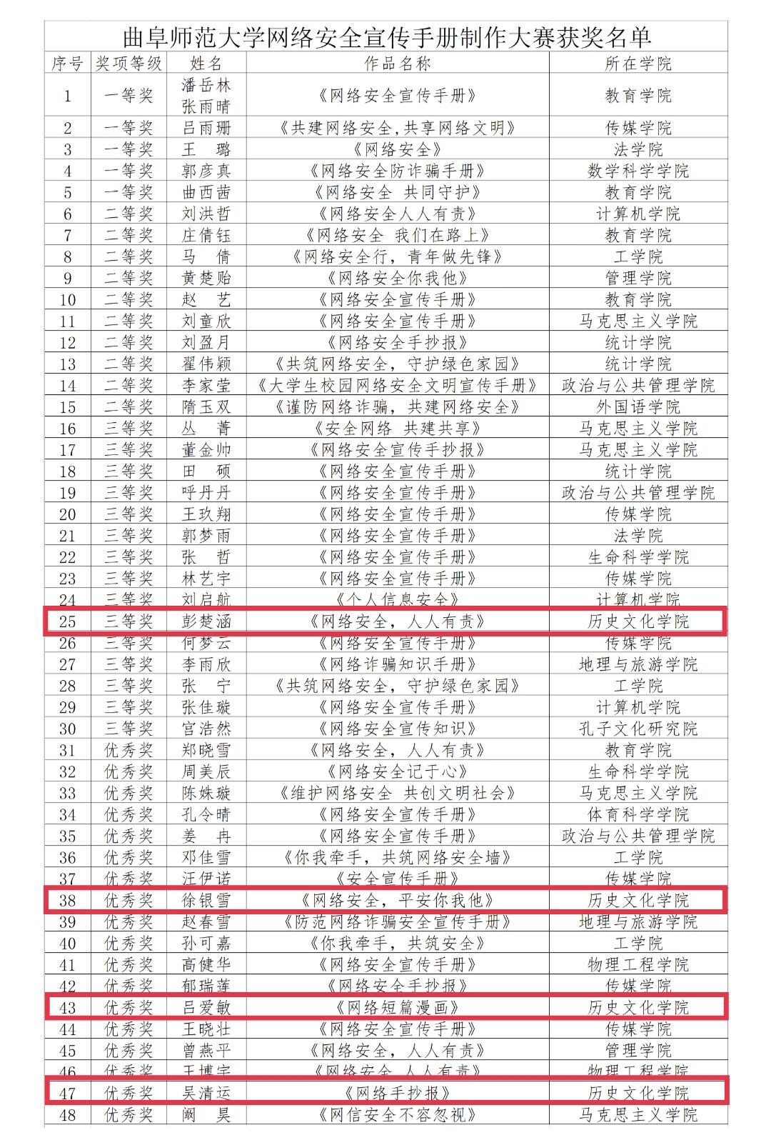 其中,在宿舍公约征集活动中,正妹av 西公寓一号楼西603宿舍荣获二等奖,西公寓一号楼西611宿舍、西公寓六号楼527宿舍荣获三等奖;在网络安全宣传手册制作大赛中,正妹av 彭楚涵同学荣获三等奖,徐银雪、吕爱敏、吴清运同学荣获优秀奖;在“你我牵起手,共筑安全墙”校园安全PPT大赛中,正妹av 王灵玉同学荣获三等奖。