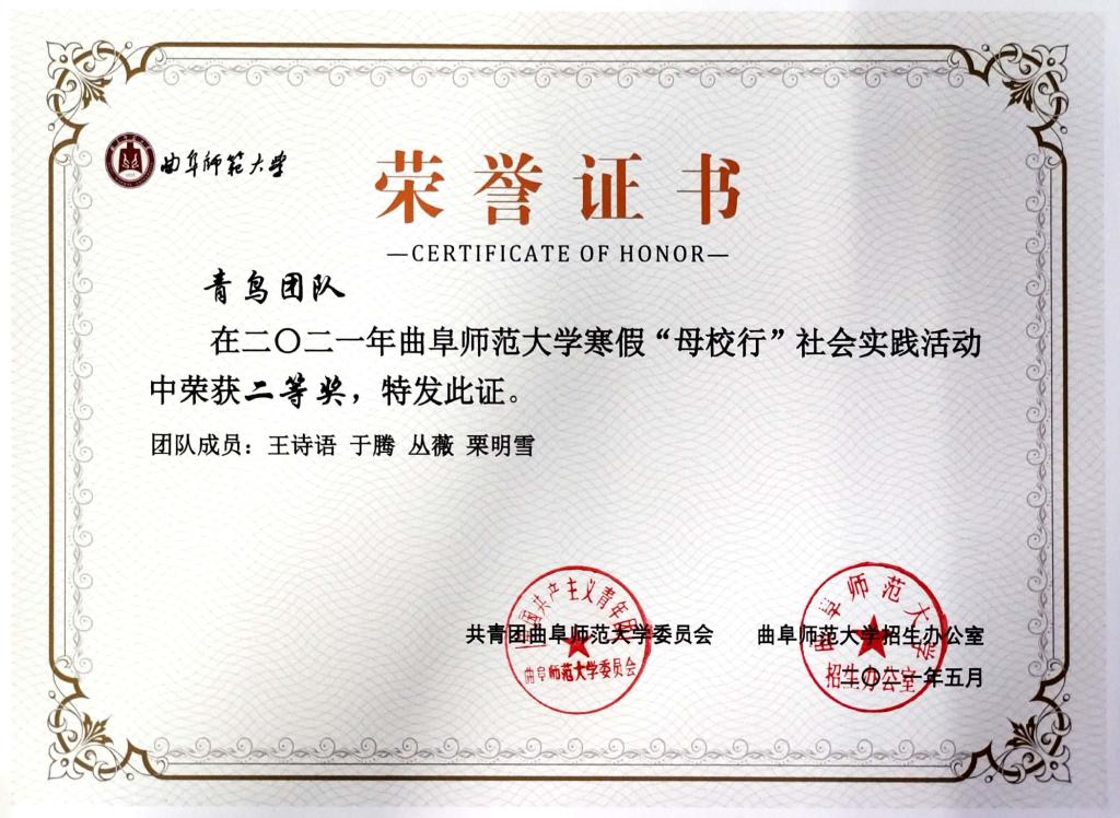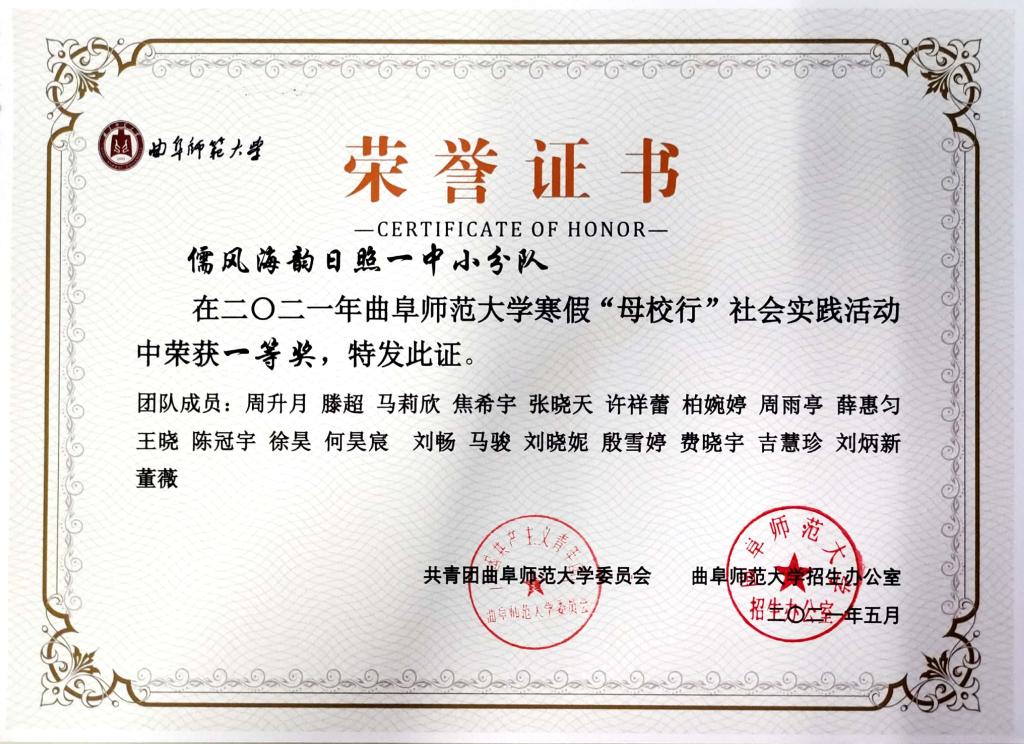 近日,“青鸟计划”主题实践活动与寒假“母校行”社会实践活动评选结束。正妹av 学子在活动中取得佳绩。“青鸟计划”主题实践活动中,胡纪新、胡梦潭、柴皓鸽等18名同学被评为“优秀学子”。 寒假“母校行”社会实践活动中,儒风海韵日照一中小分队荣获一等奖,青鸟团队、属你唯“一”队荣获二等奖。