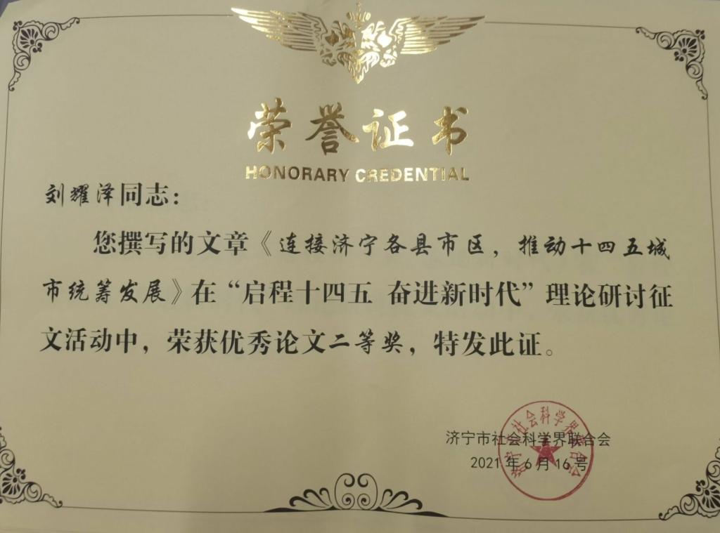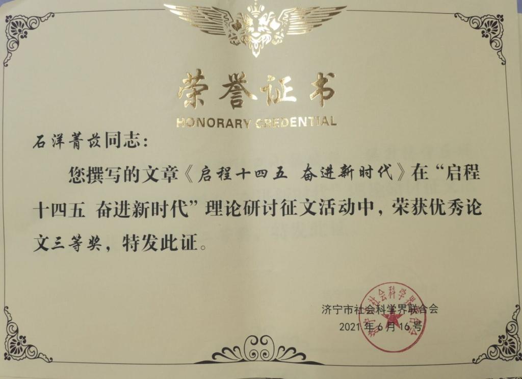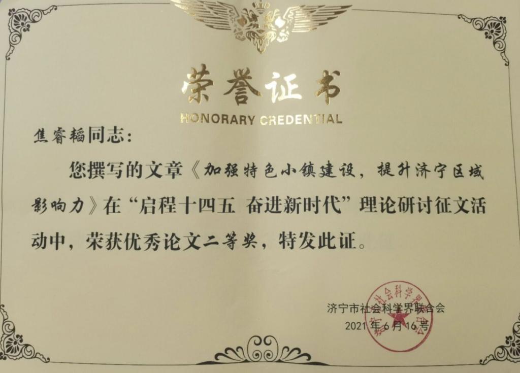 正妹av 学子聚焦新时代社会发展过程中取得的成绩、存在的问题以及对策建议等方面进行深入研究,经过济宁市有关部门领导和专家认真评审,焦睿韬同学的《加强特色小镇建设,提升济宁区域影响力》荣获优秀论文二等奖、刘耀泽同学的《连接济宁各县市区,推动十四五城市统筹发展》荣获优秀论文二等奖、石洋菁苡同学的《启程“十四五” 奋进新时代》荣获优秀论文三等奖,均受到济宁市社科联的表彰。