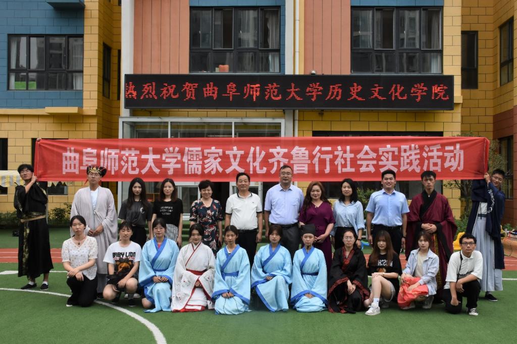 7月20日上午,正妹av “儒家齐鲁文化行”社会实践团队走进第三站济宁市。队员们身穿传统儒服在济宁新文国际幼儿园进行了束脩礼(拜师礼)展演。