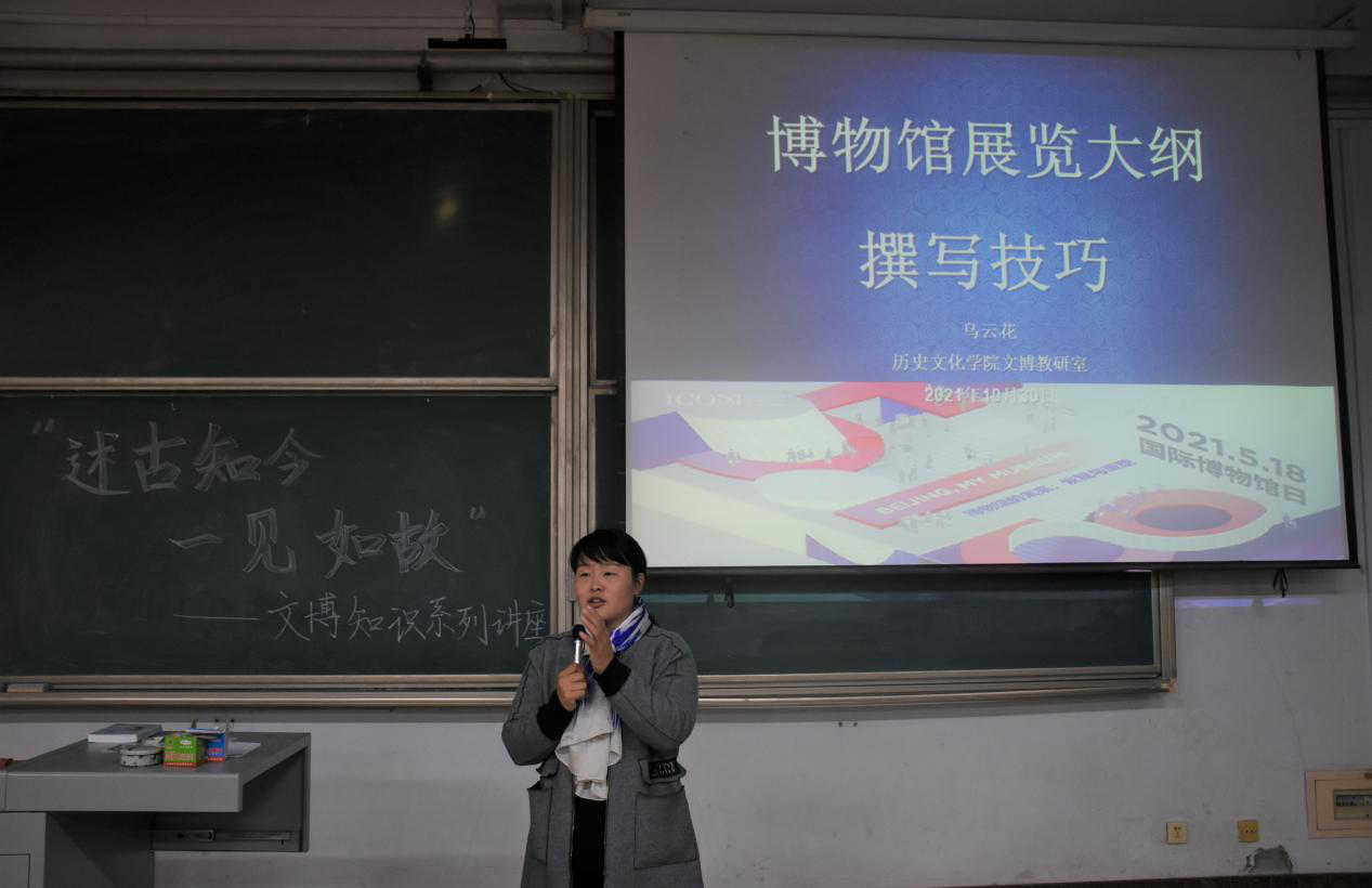 讲座上,乌云花老师以“博物馆展览大纲撰写技巧”为主题,以国际博物馆日的海报为切入点,通过互动的形式与同学们交流了对博物馆的印象以及对博物馆的感受。乌云花老师表示,博物馆是我们的第二个课堂,它不仅是收藏机构,更是教育机构,达到教育作用是博物馆的最终意义。随后,乌云花老师从五个方面对博物馆展览大纲撰写技巧进行了详细讲解。最后,乌云花老师简要介绍了展览大纲的基本结构,并且耐心解答了同学们的疑问。