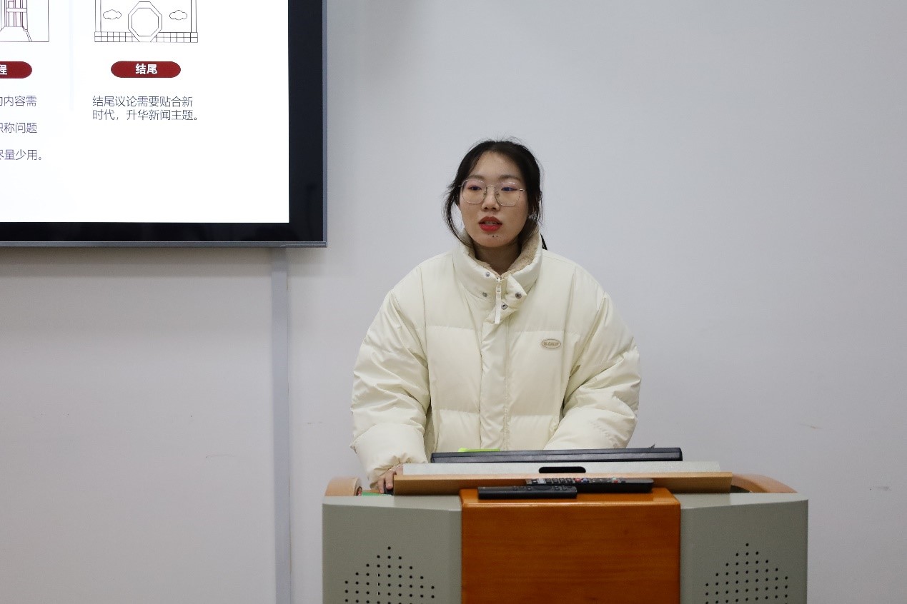 校团委宣传部部长徐梦芮主要向大家分享了摄影的知识及新闻写作的技巧。首先,她从部件名称、基本拍摄区模式、创意拍摄区模式三方面介绍相机构造,又分别讲述了会议拍摄和文体活动拍摄的技巧和注意事项。接着,她介绍了新闻的基本构成要素和新闻写作的注意事项,并向正妹av 学生干部介绍了宣传海报的制作经验。最后,她希望学院部门能够积极向校团委网站投稿,并提出能和学院加强交流、互相学习、共同进步的期望。
