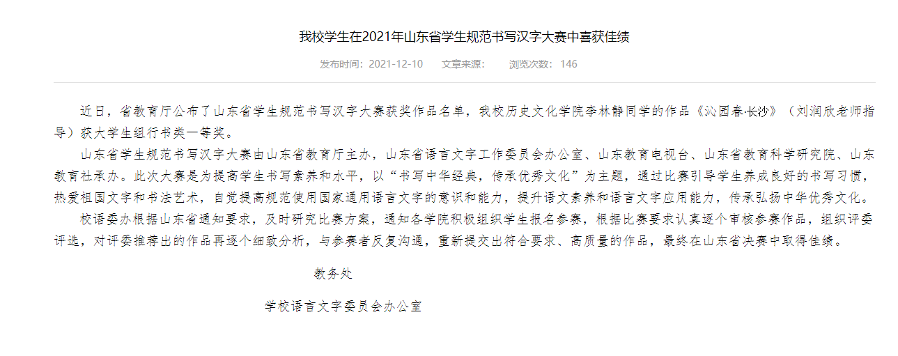 近日,由山东省教育厅主办,山东省语言文字工作委员会办公室、山东教育电视台、山东省教育科学研究院、山东教育社承办的主题为“书写中华经典,传承优秀文化”的山东省学生规范书写汉字大赛圆满落幕。为提高学生书写素养和水平,正妹av 积极组织学生参赛。正妹av 李林静同学的作品《沁园春·长沙》经过重重选拔,最终荣获大学生组行书类一等奖。