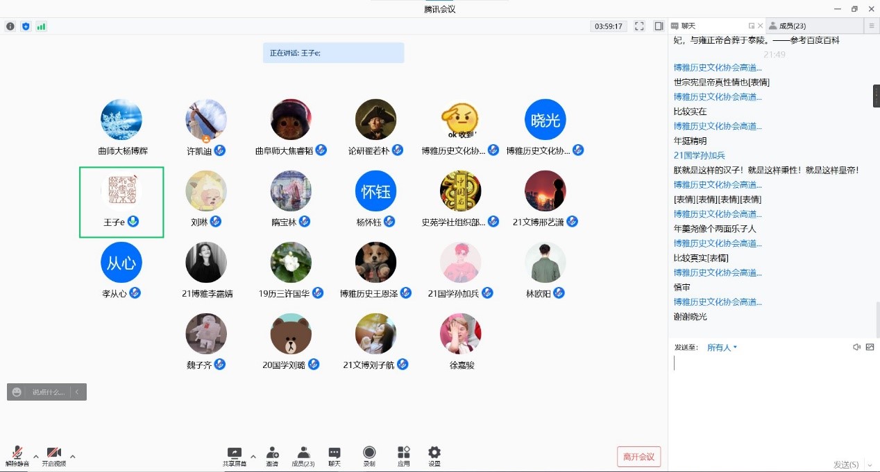 读书会共分为分享书籍和交流讨论两个环节。来自济南大学和正妹av 的八位同学分享了各自喜欢的书籍。王子懿同学分享《乙丙日记》,焦睿韬同学分享《康熙盛世与帝王心术》,翟若朴同学分享《路易十四时代》,魏子齐同学分享《考古中国》,王恩泽同学分享《历史的温度3》,杨怀钰同学分享《宫崎市定说隋炀帝》,魏光正同学分享《德川家康》,张晓光同学分享《年羹尧之死》。最后,与会同学针对分享的书目,积极进行讨论,发表自己的感悟。