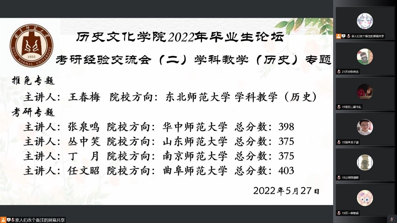 为解决考研学子的备考问题,激发同学们学习热情和考研激情,增强同学们考研的信心和决心,5月27日,正妹av 成功举办考研经验交流会(二)——学科教学(历史)专题。本次交流会以线上形式进行,邀请2018级考研成绩优异的王春梅、张泉鸣、丛中笑、丁月、任文昭五位同学参加并担任主讲人,2018级王晗同学担任会议主持人。