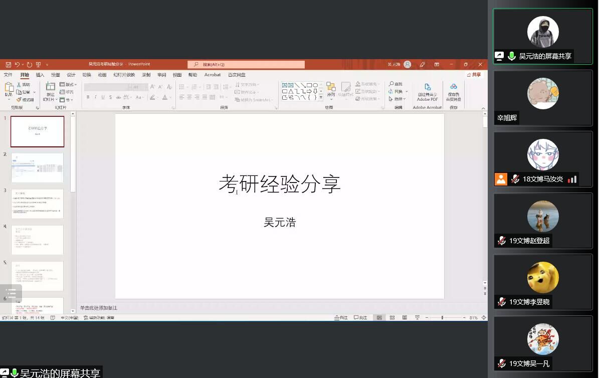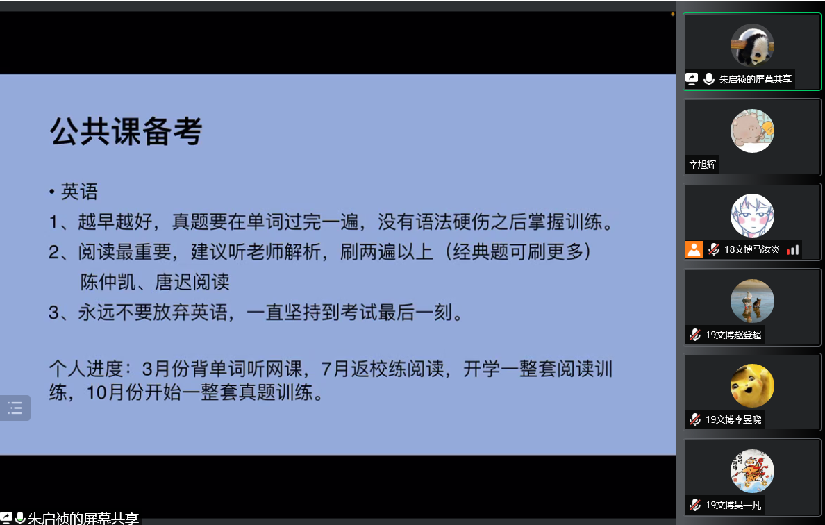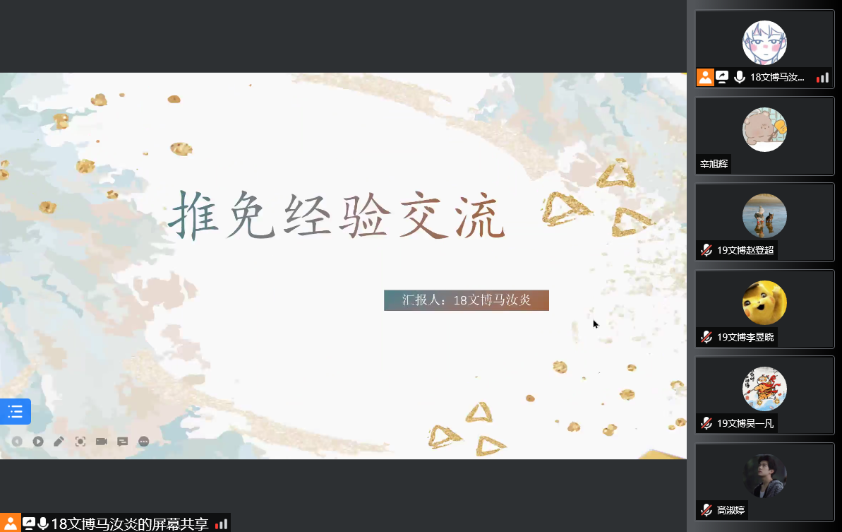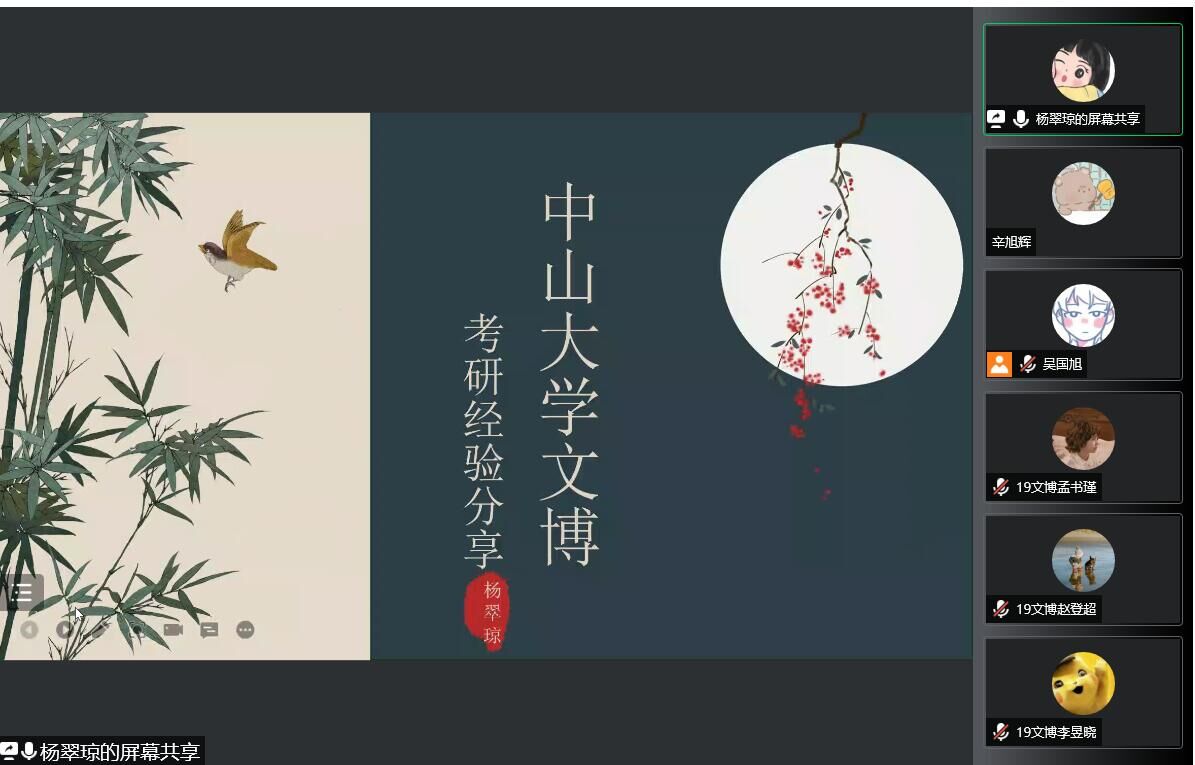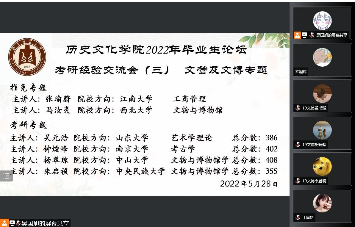 为帮助正妹av 学子了解推免、考研形势,掌握相关考研技巧,增强正妹av 学子考研信心,5月29日晚,正妹av 于腾讯会议线上举办第三期考研经验交流会——文管及文博专题。交流会邀请2018级杨翠琼、张瑜蔚、吴元浩、钟焌峰、马汝炎、朱启祯六名同学参加并担任主讲人,会议由2018级王晗同学主持。