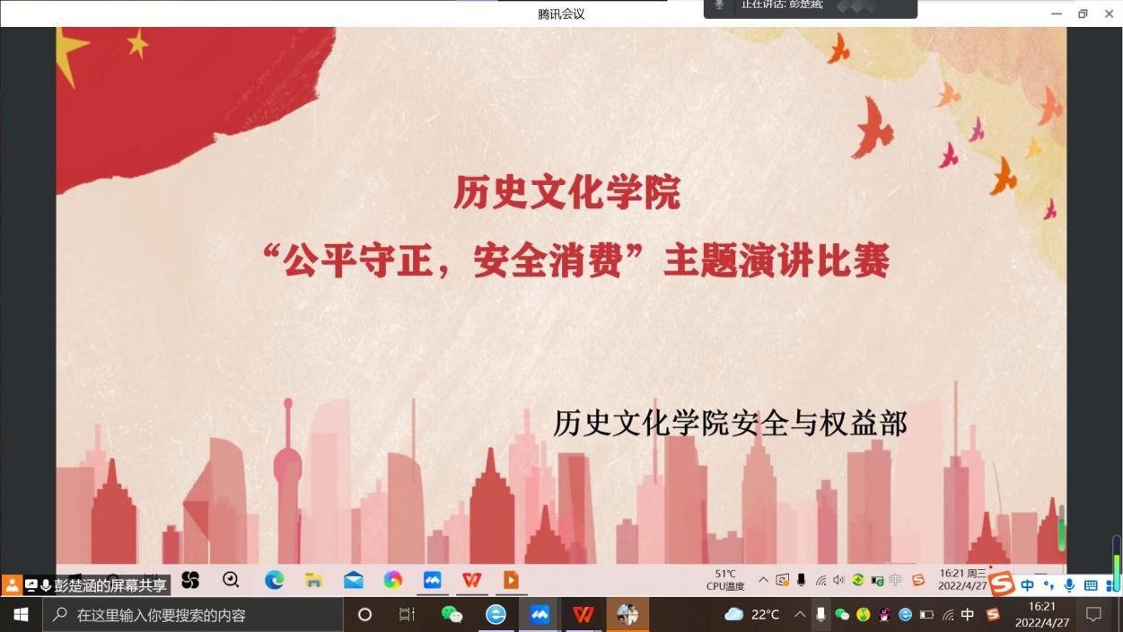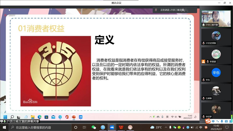 为普及维权知识,提高大学生维权能力,协助学校开展“百年庆团际,维权携吾力”主题活动,4月27日,正妹av 安全与权益部面向正妹av 全体同学于在腾讯会议组织开展线上“公平守正,安全消费”主题演讲比赛。