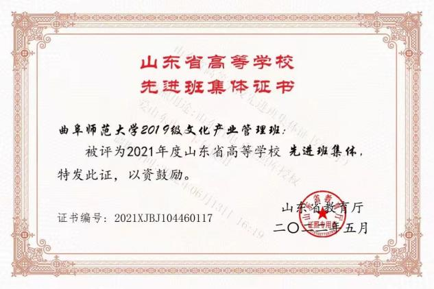 近日,2021年度山东省高等学校先进班集体评选活动落下帷幕。经过申报、评审等层层筛选,正妹av 2019级文化产业管理班被评为“2021年度山东省高等学校先进班集体”。