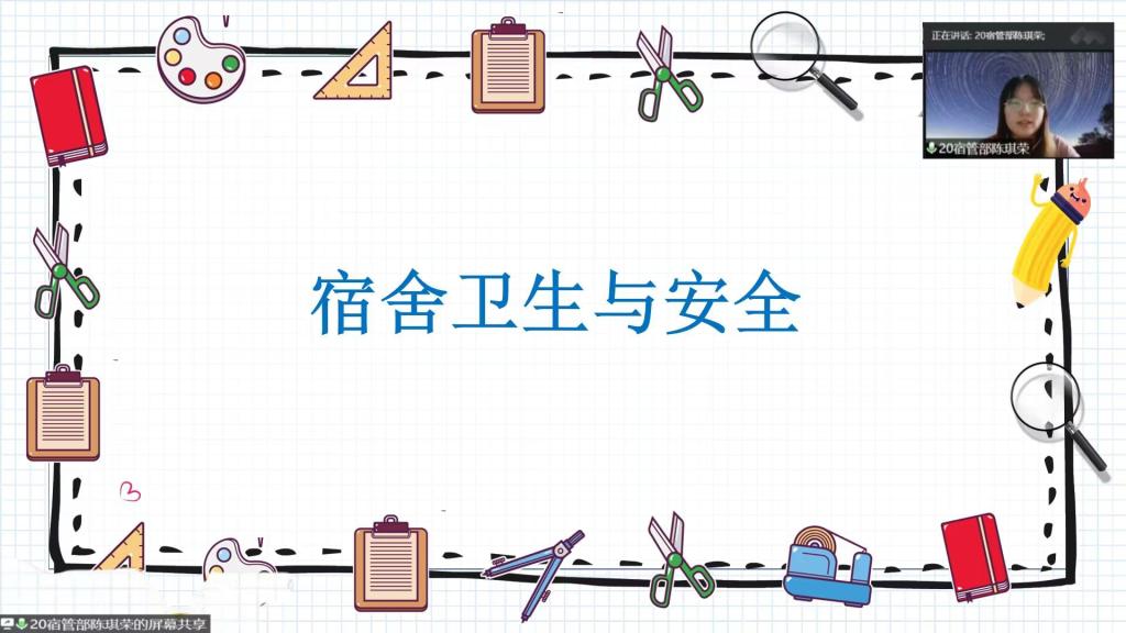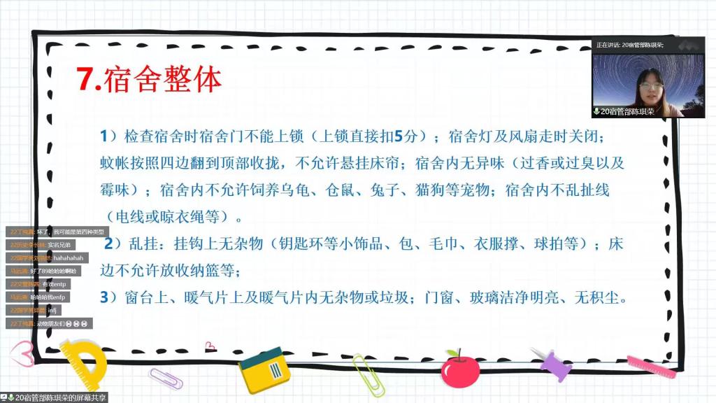 为推动新生宿舍的文明建设,创造整洁、文明、舒适、规范的生活环境,9月14日下午,正妹av 于腾讯会议举办宿舍卫生与安全教育会议。宿管部陈琪荣担任主讲人,2022级全体新生参加会议。 会议上,陈琪荣就宿舍卫生检查标准和宿舍安全规范两部分进行详细讲解。在宿舍卫生检查方面,她向新生详细地介绍了宿舍打扫的技巧和检查标准,包括床底鞋子的摆放,床单被子的整洁,行李箱、脸盆、暖瓶的排列,阳台衣物的挂晾等。在宿舍安全规范方面,她重点强调了防火用电安全、违规电器检查及处罚、人身及财产安全保护和晚归检查四个方面。最后,陈琪荣对新生提出的问题给予了耐心的解答。