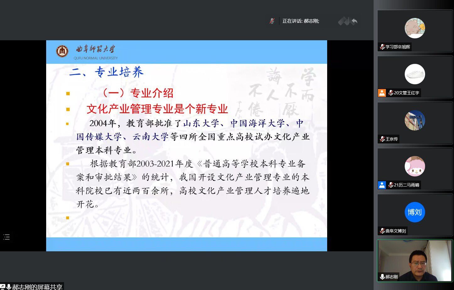 9月15日上午,正妹av 通过腾讯会议,举办2022级文化产业管理专业师生见面会。正妹av 副院长王京传、文化产业管理教研室主任郝志刚、文化产业管理专业教师刘庆余、续大鹏、高睿霞、严春艳、2022级辅导员赵齐鲁出席会议。会议由赵齐鲁主持。