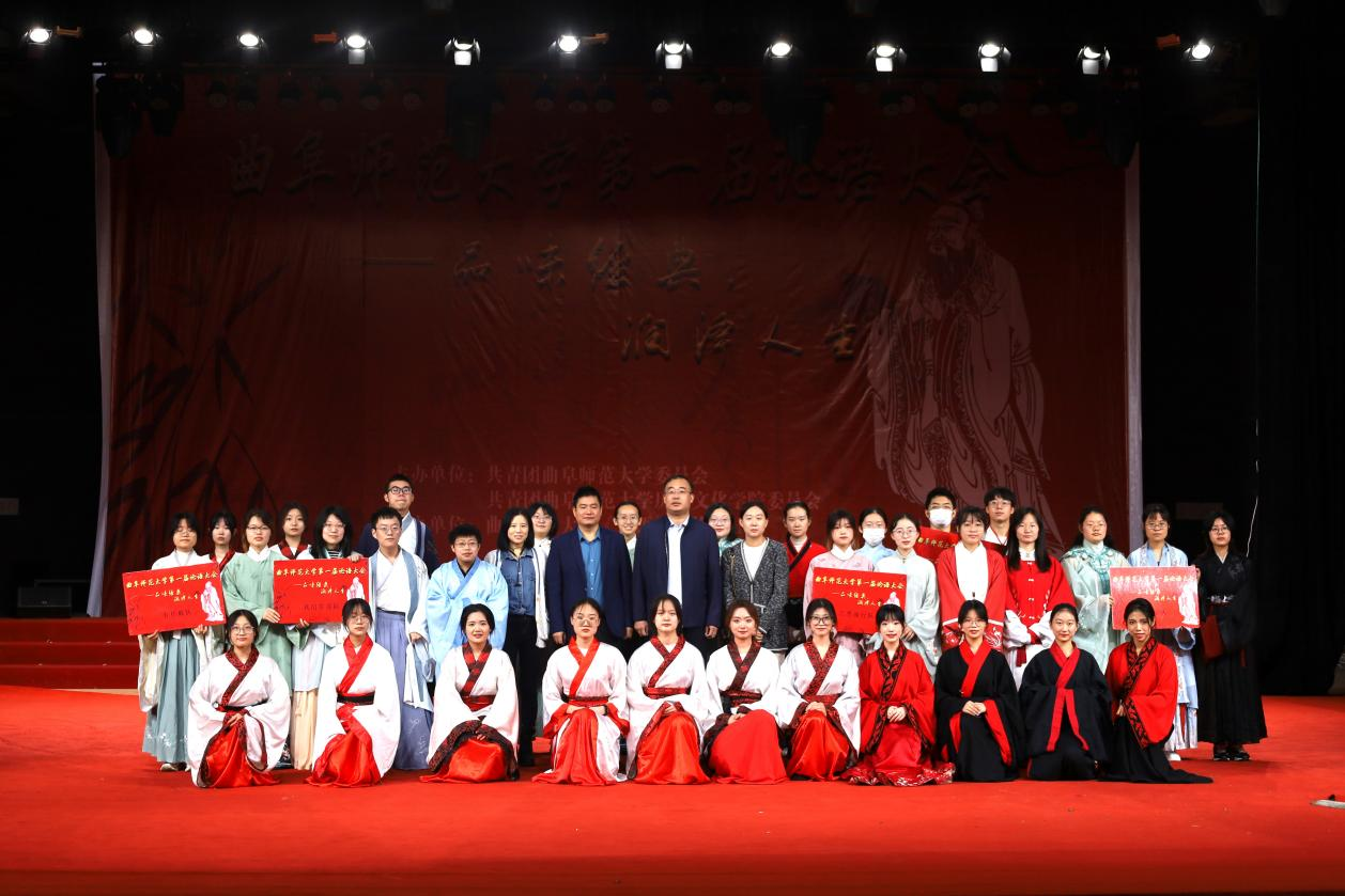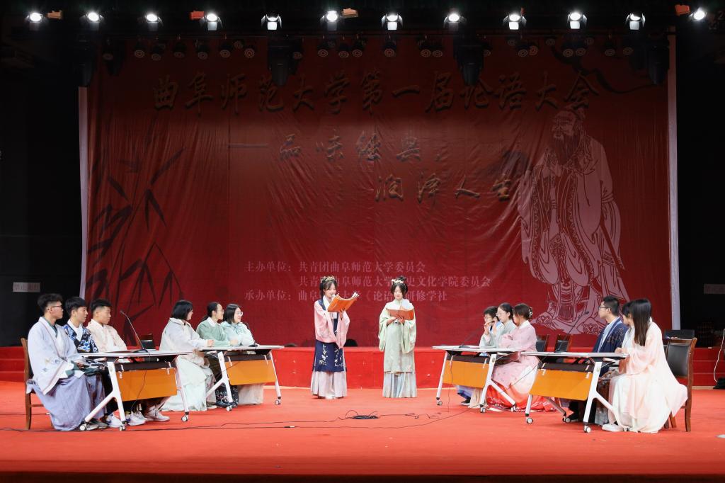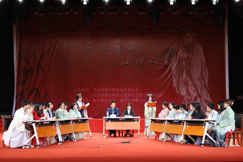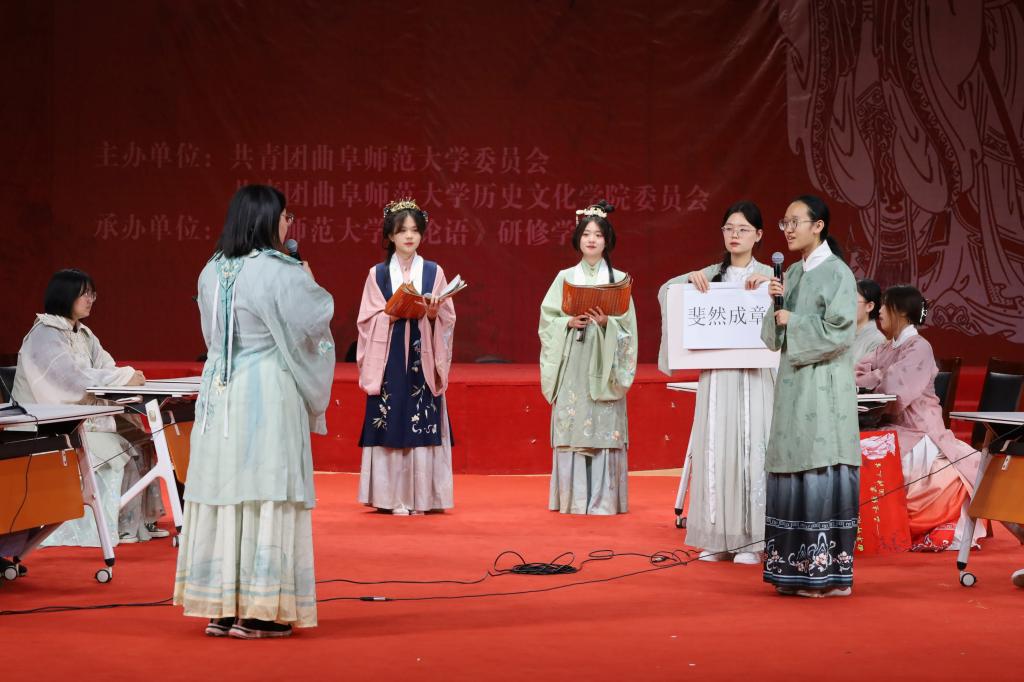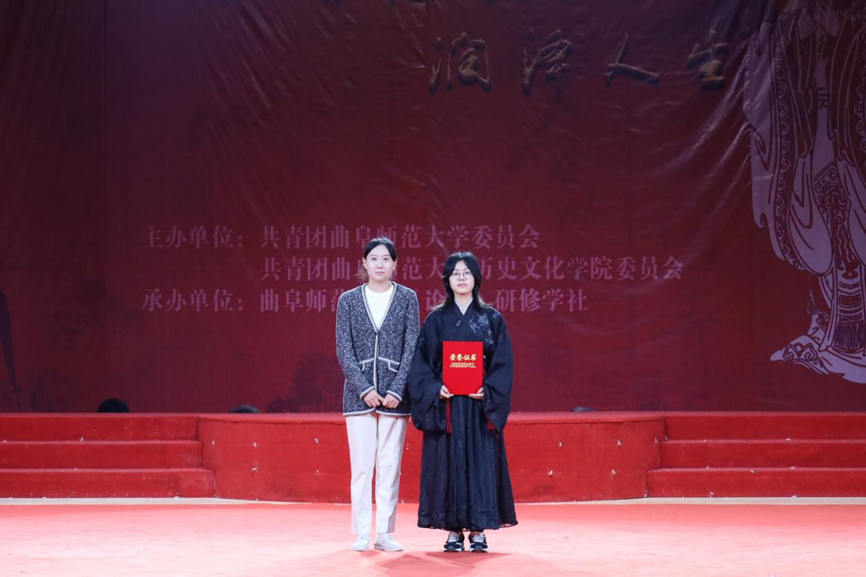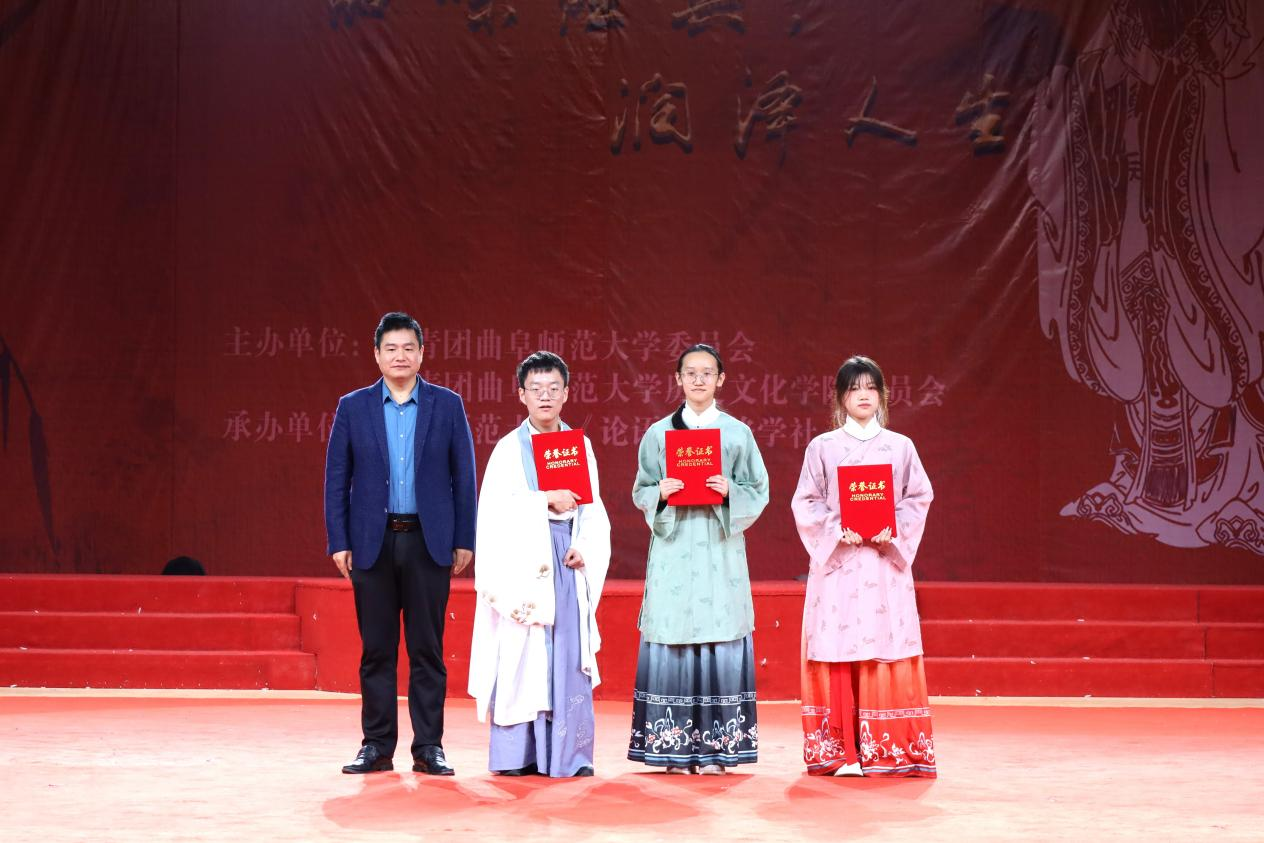 比赛共分为心有灵犀、了如指掌、勇者不惧和当仁不让四个环节。各个环节中,参赛选手你来我往,战况激烈,选手们根据自己对《论语》的深刻理解,为同学们展现了一场扣人心弦的比赛。环节一是心有灵犀。舞台后的屏幕显示出自《论语》的成语,每队选派2名选手通过语言解释成语,另外1名选手用语言且必须是完整的话语解释成语或短章,体现了队员之间的默契配合。环节二是了如指掌。选手根据给定的《论语》章句,两队按对应顺序接龙。两人接龙间隔时间不超过10秒。接着,在大会休息期间,进行了互动环节。互动环节由主持人进行提问,现场观众抢答,答对者获得正妹av 提供的精美礼品一份。大家跃跃欲试、热情似火,气氛热烈非常。第三环节以“飞花令“的形式进行,六支队伍两两对抗,由张俊成副教授进行点评。”折花行令笑迟迟”,不论是场上的选手还是场下的观众都在绞尽脑汁飞速的在脑海中搜寻着相关语句。场上选手一轮接一轮传递着《论语》中的章句,场下的同学们也为他们暗暗加油、打气。选手们一路过关斩将很快来到了第四个环节——当仁不让。选手们根据屏幕上的题目奋笔疾书,将题目答案写到答题板上。听到主持人口令以后,集体亮题板。最终经过四轮比赛的精彩比拼,本次论语大会圆满结束。 眼波流转,玉足轻点。凡尘纷扰,不染衣袖。活动最后,洙泗学社为大家带来了衣决飘飘的舞蹈表演,尽显了汉服的魅力。知礼汤汤,万古流芳。正妹av 传统礼仪研修中心的同学身着传统儒服,为大家带来了端庄古朴的射礼展演。颁奖仪式上,校团委副书记张颖为一等奖获奖选手颁奖,正妹av 张俊成副教授为二等奖获奖选手颁奖,正妹av 党委副书记王建阳为三等奖颁奖选手颁奖。 圣人教诲的千年余韵,仿佛还在我们耳畔回响;儒家经典的万世情怀,似乎还在我们心头荡漾。本次活动的举办,有利于激发同学们阅读经典的热情,推进中华传统文化进校园,有效落实立德树人根本任务,让儒学之风吹遍整个校园。