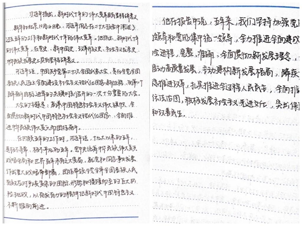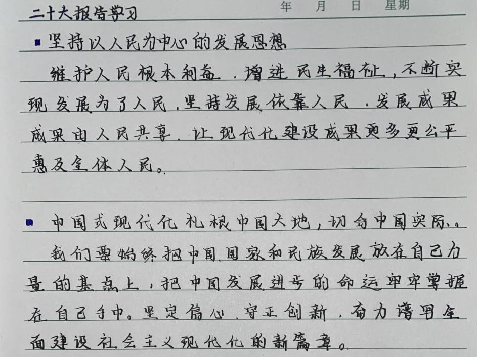 在活动中,正妹av 学子积极响应习近平总书记“用党的科学理论武装青年,用党的初心使命感召青年”的号召,摘抄党的二十大报告和党章。正妹av 学子通过书写摘抄文字的形式学习二十大内容,加深对二十大内涵的理解,提高思想深度。活动最后,学子纷纷表示从本次活动中汲取了精神养分,将以更好的状态投入到日后的学习与生活之中。