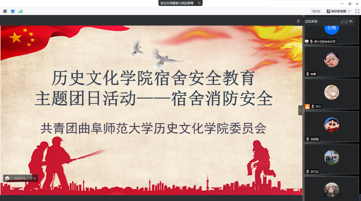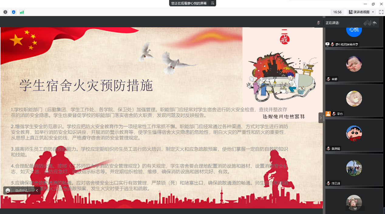 本次活动围绕宿舍消防安全教育主题,采用主题团日线上会议的形式对正妹av 学生进行全面的教育宣传。会议中,主持人通过生动详实的PPT,讲解了宿舍的火灾隐患,着重强调了学生宿舍火灾预防措施以及遇到火灾的处理方式。在最后的答疑环节中,同学们积极互动,提出疑惑,主持人耐心解答,现场气氛活跃。