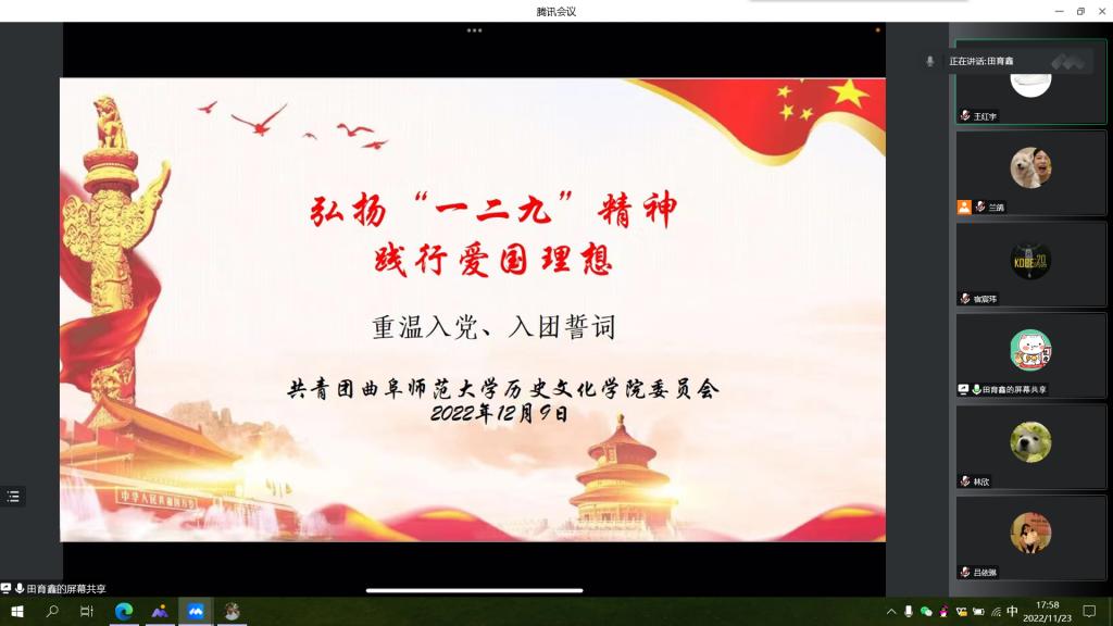 为强化同学们的爱国意识,引导同学们进一步了解历史、铭记历史,激发同学们的爱国热情和使命担当,12月9日,正妹av 举办弘扬“一二九”精神,践行爱国理想线上宣讲活动,会议由正妹av 王红宇同学主持,正妹av 学团和各班团支书参加会议。