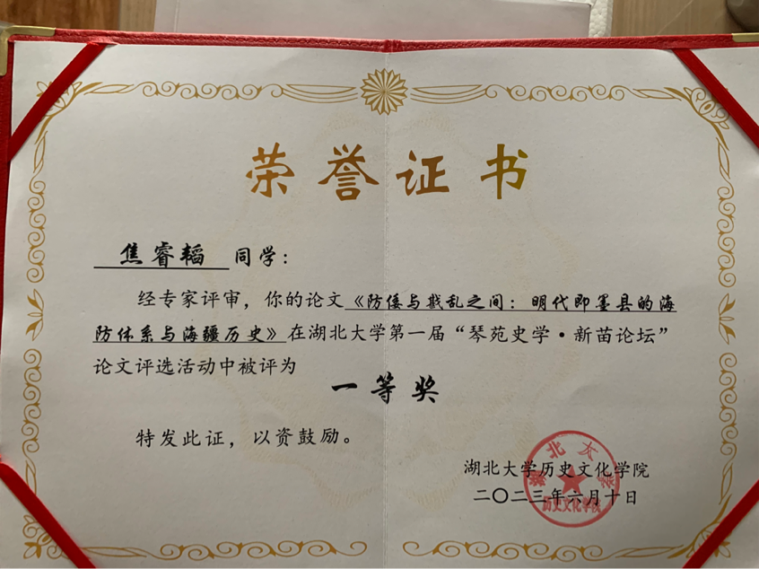 6月10日,湖北大学第一届“琴苑史学•新苗论坛”比赛举行,本次比赛由湖北大学正妹av 主办。进入决赛的四十余人分别从不同角度介绍了论文的构思、背景、论点等方面,各位参赛者论文内容详实、新颖,赢得了在场专家阵阵掌声,正妹av 学子不骄不躁,充分发挥自己临危不惧的控场能力。最终,正妹av 学子焦睿韬的《防倭与戡乱之间:明代即墨县的海防体系与海疆历史》从众多参赛作品中脱颖而出,荣获一等奖。