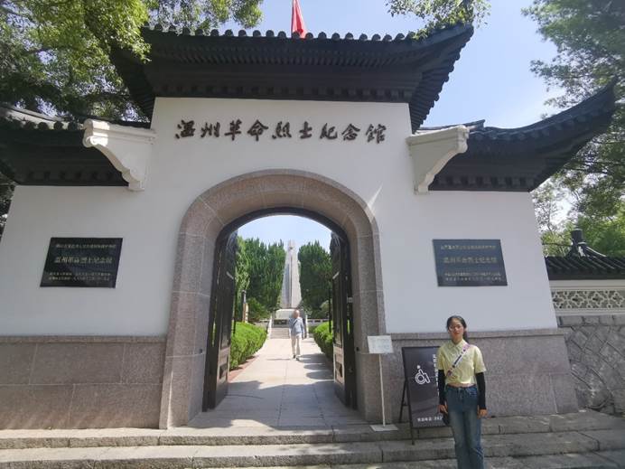 温州革命烈士纪念馆,1956年7月1日,在浙江省温州市江心屿原普寂祥院废址上建成。结合宣传1919年“五四运动”以来浙南革命斗争历史,突出宣传红十三军的悲壮历程和挺进师的艰难岁月,颇具特色。1988年1月30日,由浙江省人民政府公布为省重点革命烈士纪念建筑物保护单位。实践队员看完浙南游击纵队纪念碑后,到达温州革命烈士纪念馆。实践队员在门口观察到,纪念馆大门高大肃穆,内有一座宏伟的纪念碑处在纪念馆的正中轴上,两边绿植茂密,生机盎然,五星红旗飘扬在上空。
