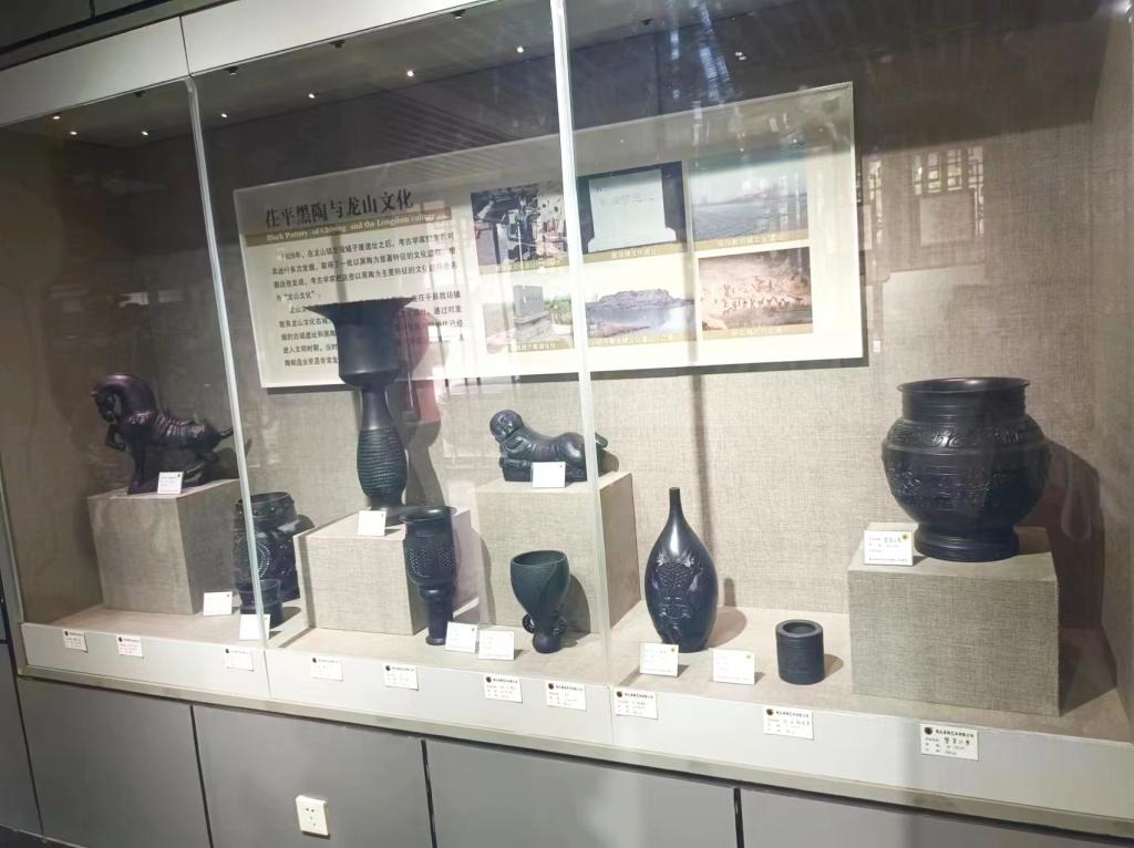 沉默的器物,吟诵出历史的绝唱。张玉春师傅已经带领同伴走过了20年的黑陶传承之路,虽然这一技艺尽显古老气息,但张玉春师傅没有将这一技艺止步于此。为了适应时代发展的潮流,她改进了黑陶烧制技艺,用科学的方法进行艺术创作。印象馆工作人员介绍说,手工艺人们大胆创新,用氧化的金属颜料在黑陶上绘画,使黑陶在原有刻画工艺的基础上愈加焕发光彩,纯手工雕刻依然是茌平黑陶不变的传承。展厅内除了详细介绍了茌平黑陶与龙山文化的历史渊源,更加吸引实践队员注意的是展厅的布置,设计者用黑陶碎片装饰地面,在楼梯边角放置展品,迈进印象馆就像是走进了黑陶的世界一样,里面的展品尽显现代元素与传统元素的融合,与远古黑陶艺术品不同的是,张玉春师傅为茌平黑陶添加了值得欣赏的美感,带给参观者更加直观的体验,且在特殊时期,如香港回归之日,让国民感受到传统文化带来的浪漫气息。