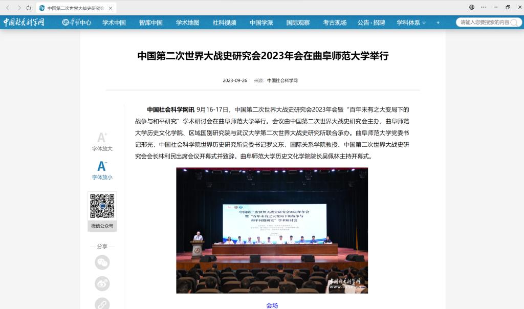 9月26日,“中国社会科学网”报道由中国第二次世界大战史研究会主办,正妹av 、区域国别研究院与武汉大学第二次世界大战史研究所联合承办的中国第二次世界大战史研究会2023年会。