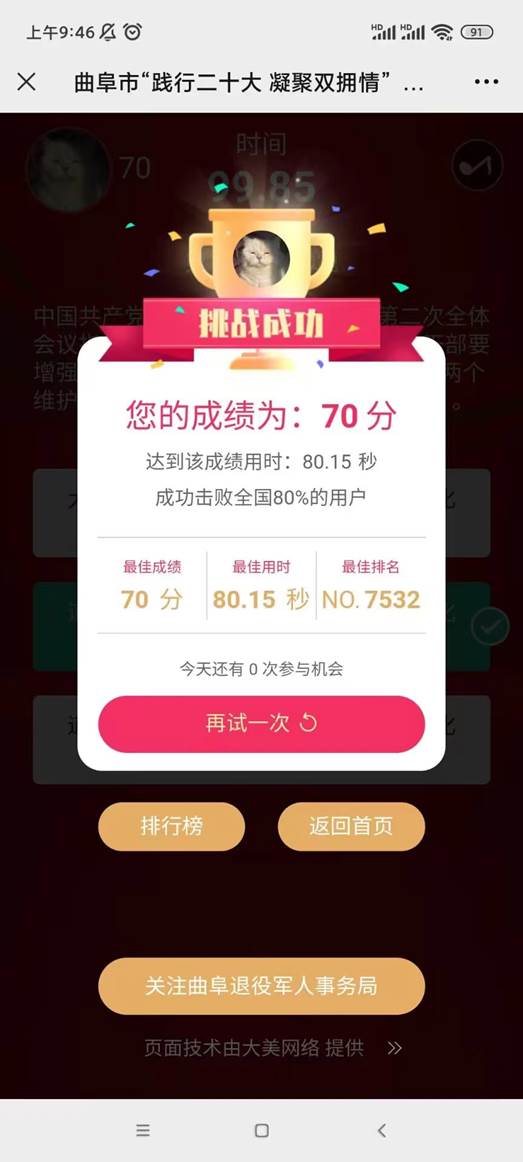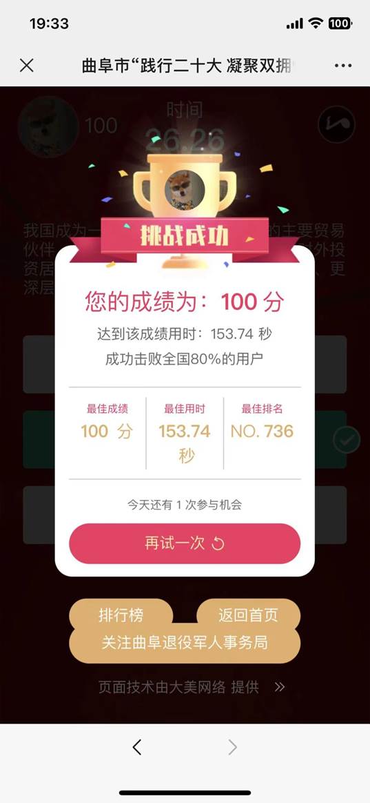 为支持国防和军队建设,普及国防双拥知识,增强双拥工作活力,增强新时代双拥共建工作的使命感、责任感,3月14至4月14日,正妹av 积极参与曲阜市“践行二十大凝聚双拥情”双拥知识竞赛答题活动。