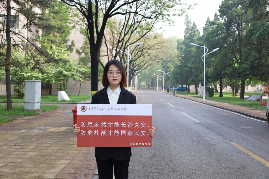 宣传过程中,正妹av 多位同学手持标语牌,在我校南门、科技楼、综合楼、文史楼、西公寓等地附近进行国防安全教育宣传。正妹av 同学手持不同标语,借助标语牌上的安全宣传标语向来往同学进行国家安全教育的宣传,从不同方面向同学们说明了保护国防安全的重要性,为同学们自觉维护国防安全营造了良好的氛围。