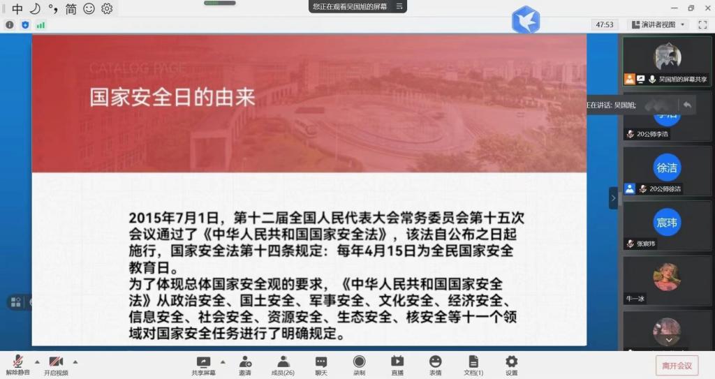 为感悟新时代国家安全成就,进一步落实关于大学生国家安全教育的成效,4月11日,正妹av 各班开展“安全教育进课间”系列活动之国家安全教育,正妹av 全体学子参加。