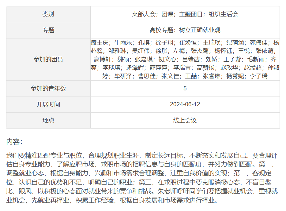 本次活动以线上会议的形式开展,2021级团支部重点帮助同学们了解自己的职业兴趣、能力和价值观,通过组织学生间进行经验交流,让同学们互相学习、互相启发,了解自我,并通过自我评估、职业咨询等方式明确自己的职业发展方向。