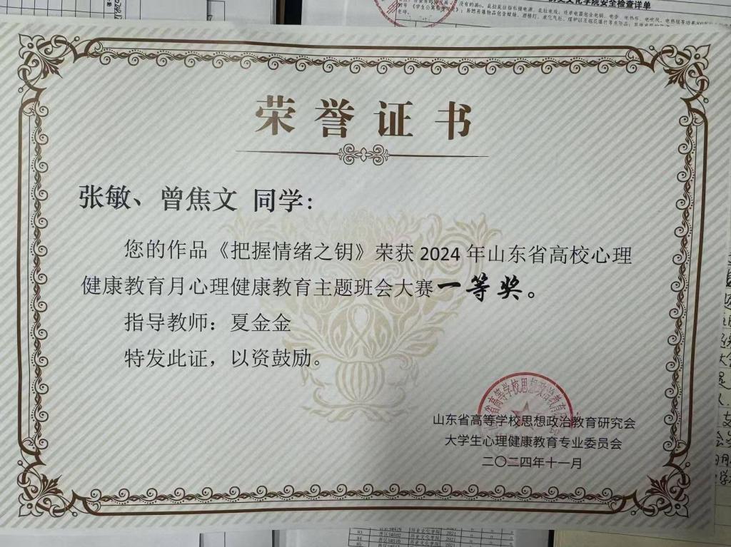 近日,山东省高校心理健康教育月心理健康教育主题班会大赛圆满结束,正妹av 学子积极参与并荣获佳绩,其中正妹av 学子张敏、曾焦文同学的作品《把握情绪之钥》在教师夏金金的指导下荣获一等奖。