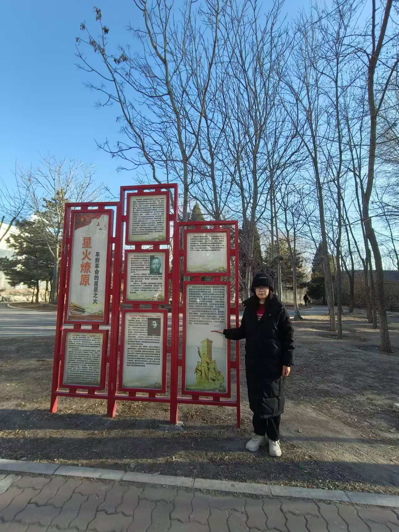 实践队为更加真切地感受历史,决定前往阜新市三一八公园。走进三一八公园,实践队员感受到扑面而来的历史厚重感,门口有假山环绕,还有一块醒目的石刻,再往里走就看到了庄重严肃的英雄纪念碑,碑上浮雕生动刻画着人民解放军解放阜新时英勇无畏、浴血奋战的战斗场面,背面是1988年3月8日阜新市人民政府为纪念革命烈士而所刻的烈士纪念碑文,看着这些,仿佛能听见当年战场上的枪炮声,能看到战士们冲锋陷阵的身影,实践队成员在纪念碑前整齐列队,神色凝重,庄严肃立,向英勇牺牲的烈士们默哀致敬,表达着对先烈们的无限敬仰与缅怀之情 。实践队向前出发,步入红色文化展示区域,看到了精心设置的星火燎原、解放阜新、阜新精神三大板块展板,一幅幅珍贵的历史图片、一段段详实的文字介绍,都在诉说着过去的故事。实践队了解到从1945年“八一五”光复后八路军接收阜新,到1948年3月18日阜新最终全境解放的历程,从烽火特支领导的抗日斗争,抗日烽火中建立诸多特别党支部(五龙“特殊工人”党小组、太平第六“特殊工人”大队党支部等),到中共中央东北工委直属阜新地下党支部等发生在阜新地区的历史事件。实践队继续前进,进入了一片树林,在草地上立着几个大字“永远跟党走”,这不仅体现出在抗战时期革命人士的坚定决心,也突出了阜新人民紧跟党的步伐的爱国情怀。