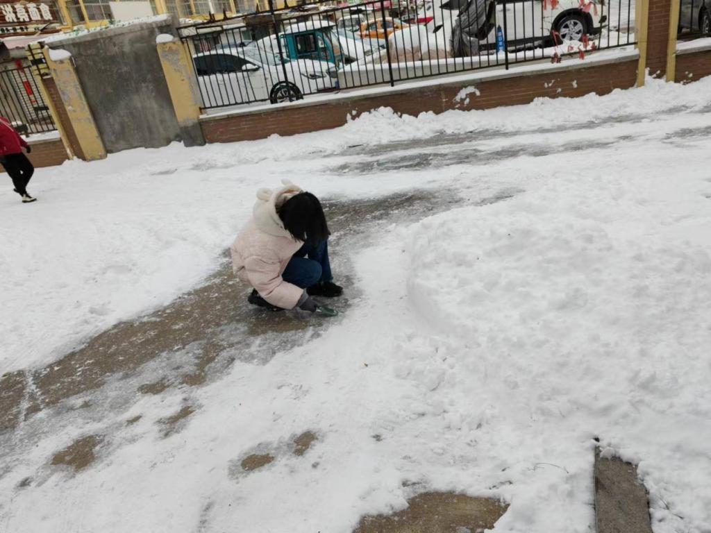 实践队员根据路面状况灵活运用多种工具开展作业:针对单元门台阶、人行道砖缝等易滑区域,使用小型除冰铲精细破除顽固冰层;对主干道及广场等大面积积雪区,采用大号雪铲集中清理压实雪块;同步配合扫帚清扫残余碎雪,并在坡道、盲道等关键位置铺设防滑垫。作业过程中,实践队员积极配合物业工作,与相关工作人员及其他志愿者按楼区划分责任区,采取分组轮换、人机配合等方式提升效率,重点保障老年人、儿童活动场所及机动车通道畅通。尽管寒风刺骨,但实践队员干劲十足,忙碌的身影成为冬日里的一抹亮色。