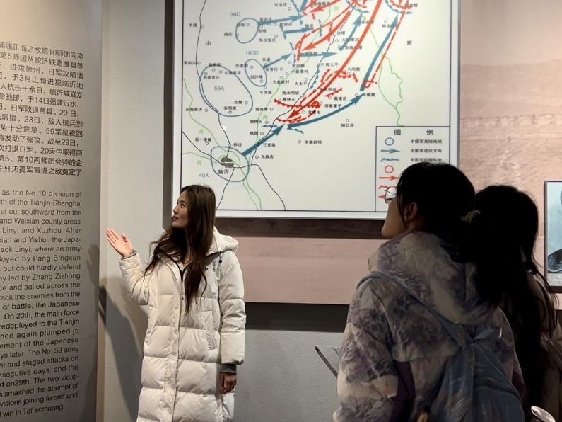 台儿庄,作为抗日战争中具有重要意义的战场,见证了中国人民顽强抵抗外敌侵略的决心和勇气。实践队员们怀着崇敬的心情,走进台儿庄大战纪念馆,追溯那段硝烟弥漫的烽火岁月。实践队员通过现场讲解员的生动叙述和实物展示,全面了解了台儿庄战役的过程、战斗细节以及它对中国抗战全局的深远影响。队员们还特别设计了基于台儿庄战役地图的历史重走线路,通过实地走访战役遗址和纪念碑,队员们亲身体验了当时的战斗布局和战略部署。站在纪念碑前,队员们深刻感受到了战争的残酷与人民的伟大斗争精神。