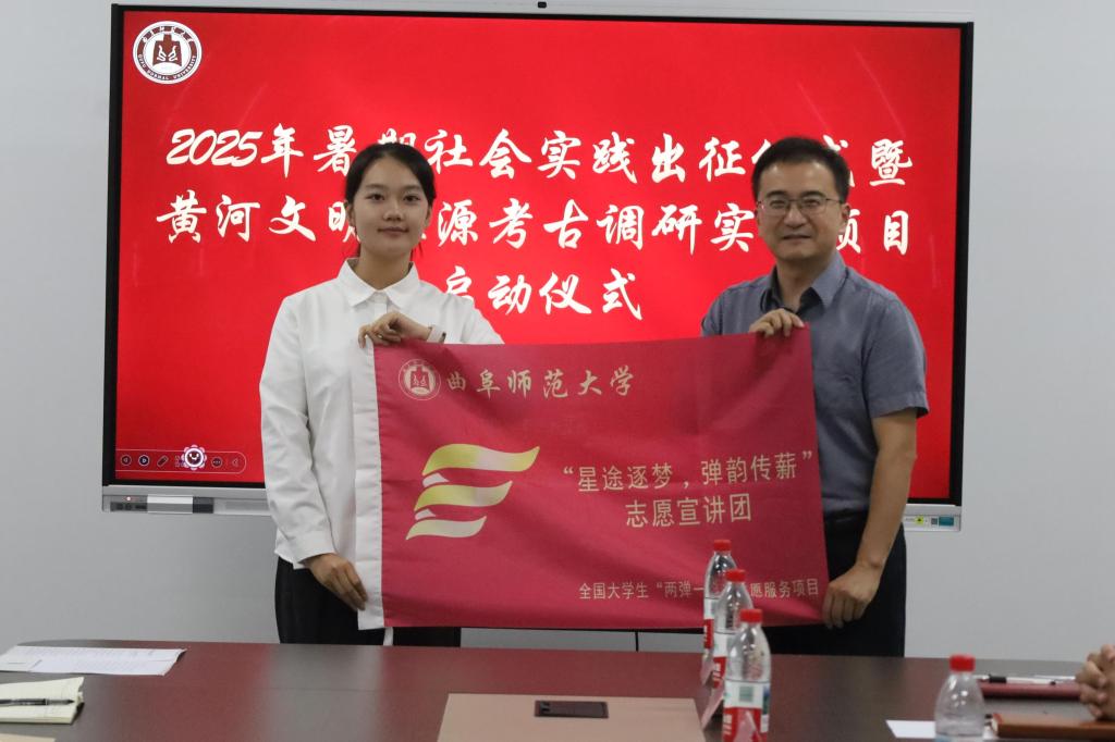 仪式伊始,王建阳充分肯定了学院历年社会实践取得的丰硕成果,强调了实践育人的重要意义,叮嘱大家在实践中注重安全、协调配合,以扎实行动增强活动实效。随后,吕厚轩宣读了2025年国家级志愿服务团队立项名单,为实践工作指明了方向。陈德洋详细介绍了黄河文明探源考古调研实践项目的具体实施方案,为参与师生明确了工作目标和实施路径。学生代表王锦涛作表态发言,表达了青年学子投身实践、探索求知的坚定决心。最后,在授旗环节中,孔轶众与姜开勇共同为国家级社会实践代表队授旗,王京传为学院重点实践队伍授旗,正式拉开了2025年暑期社会实践活动的帷幕。
