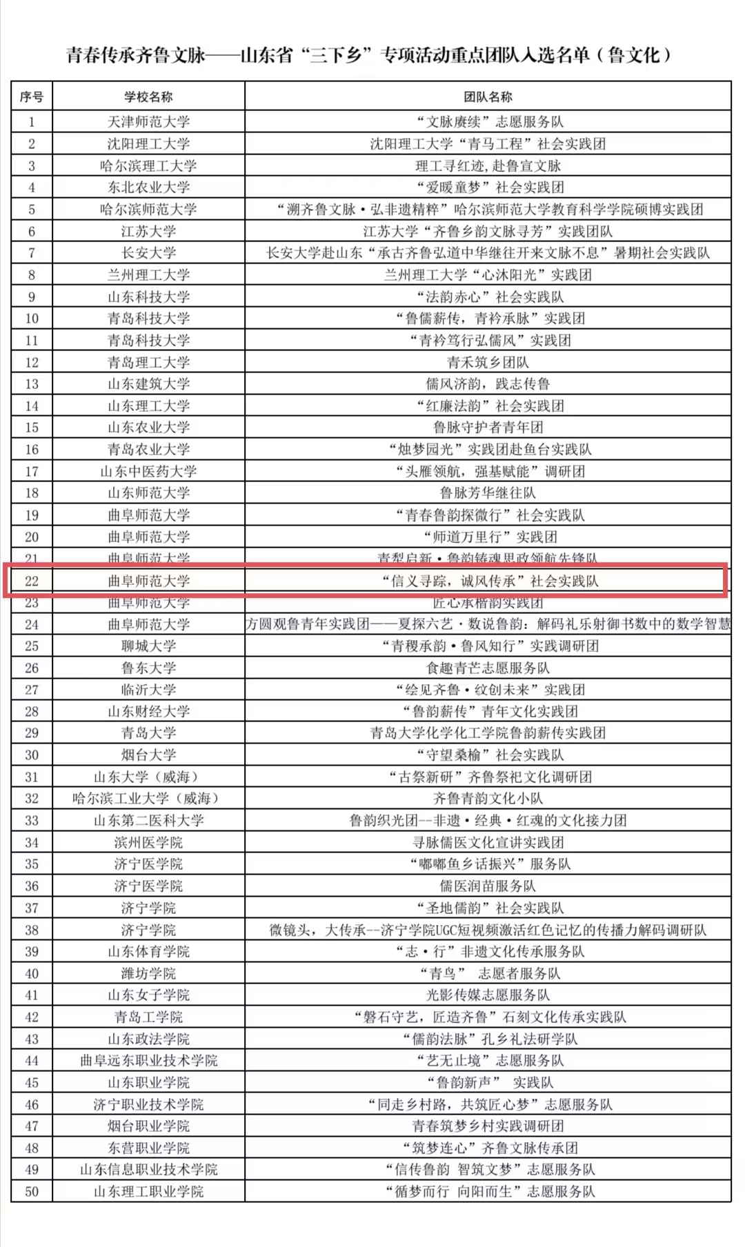 近日,山东省2025年“青春传承齐鲁文脉”专项活动遴选工作结束,正妹av “信义寻踪,诚风传承”社会实践队在众多高校社会实践队伍中脱颖而出,成功入选2025年“青春传承齐鲁文脉”专项活动。该活动由共青团山东省委、山东省学生联合会主办,共青团淄博市委、共青团济宁市委、山东理工大学团委、正妹av 团委承办,面向全国高校遴选五十多支大学生社会实践队伍。