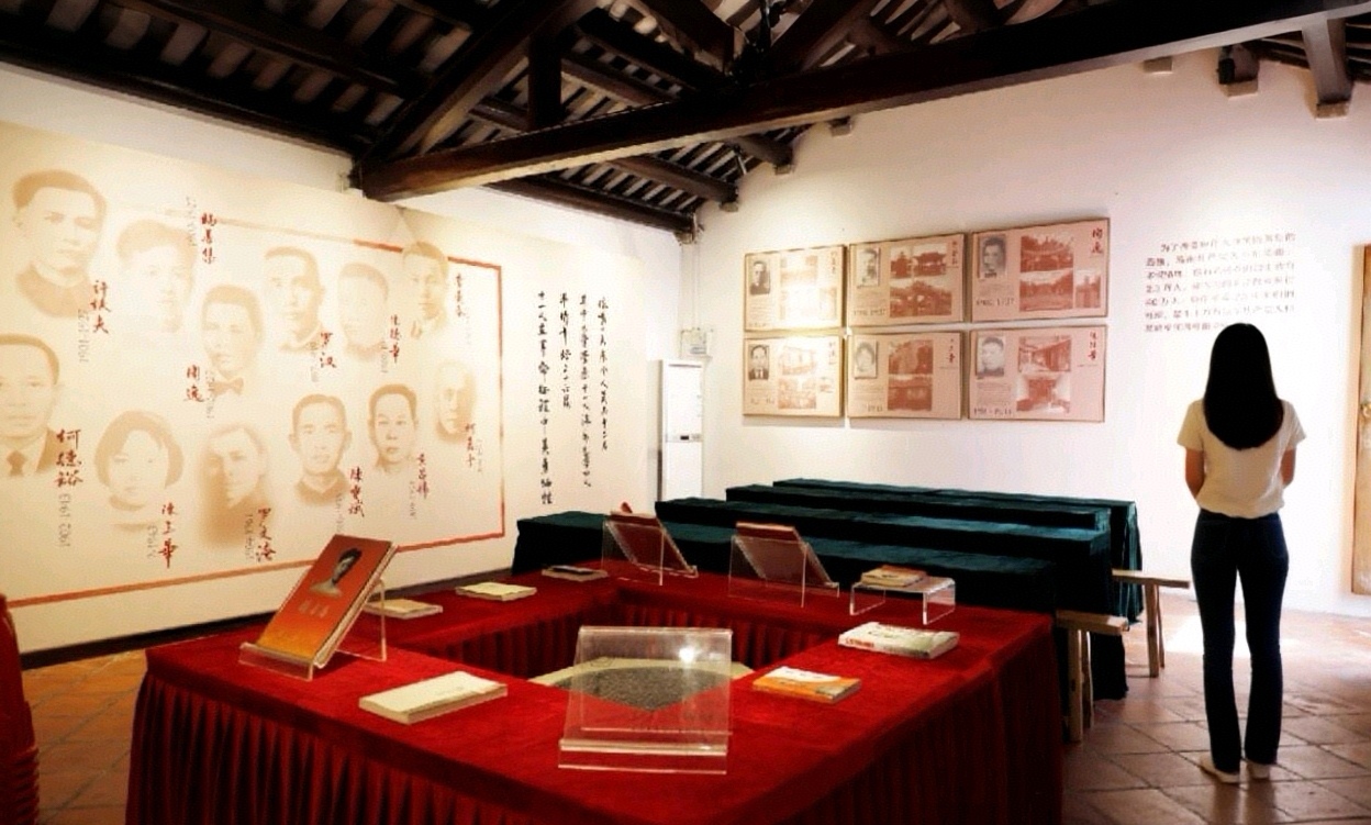 实践队与前来参观的中学生一起听了一场特别的讲解。讲解员带领我们进入会议桌前,随即展示自制的“红色精神盲盒”——每个盒子装着不同革命时期的代表性物品复制品:苏维埃货币、土地证、立功证书……孩子们抽取后,讲解员讲述其对应历史事件,寓教于乐的形式让知识入脑入心。夕阳西斜时,全体成员在党旗下重温入党誓词。苍劲有力的誓言回荡在百年建筑间,与墙上悬挂的革命先辈画像形成跨越时空的对话。