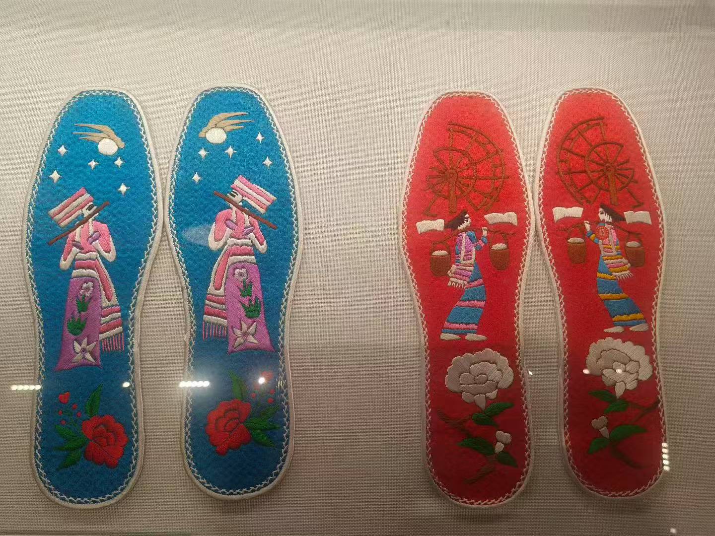 绣鞋垫展区内,陈列有蓝底与红底两组绣品。蓝底绣品包含人物、星月、花卉图案,红底绣品则采用独特纹样设计,两组绣品均展现出细密均匀的针脚与和谐的色彩搭配。