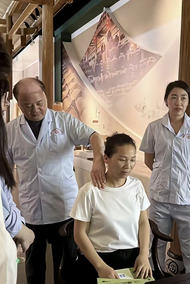 恩施庄氏正骨法展示区域内,实践队员们保持安静观察状态,聚焦于展示技法的传承人。演示过程中,传承人首先通过观察志愿者体态,随后以手指触诊其颈部、肩部,确定骨骼位置状态后,以快速精准的手法完成肩部复位,整个过程连贯流畅,志愿者肩部姿态得到明显矫正。实践队员们对正骨流程进行记录,包括观察体态、触诊定位、手法复位等步骤。通过传承人的讲解,队员们了解到庄氏正骨法历经数代传承,以口传心授与临床实践为主要传承方式,其理论体系包含中医整体观与筋骨同治理念。