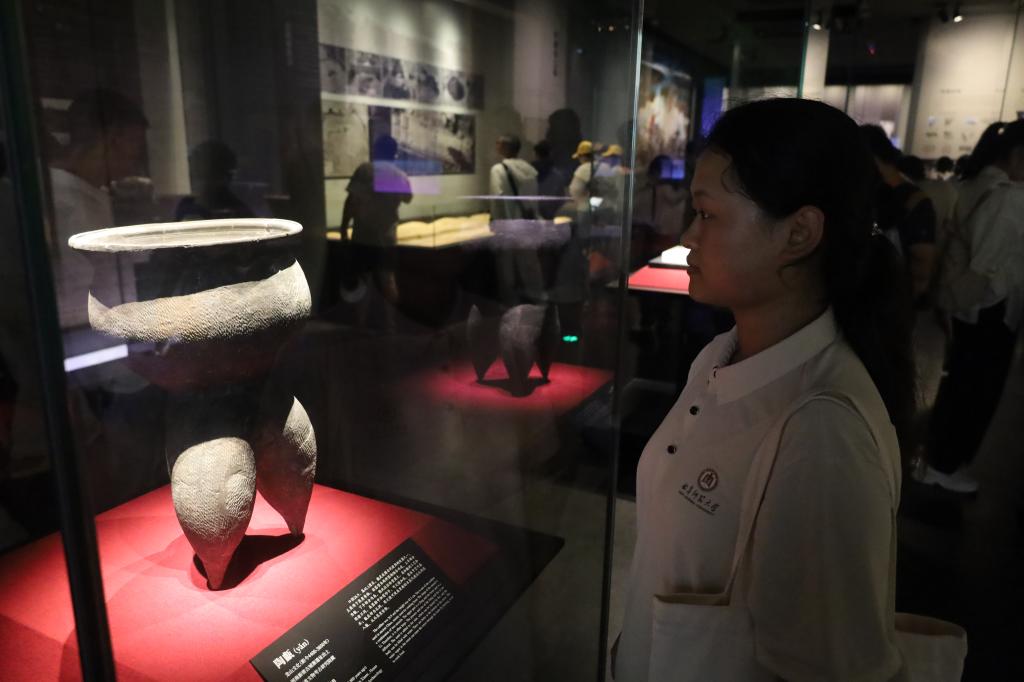 此外,展厅内的陶器、玉器、骨器等文物也各具特色:大口尊上的刻画符号可能是早期文字的雏形,三足鼎展现了夏代先民的生活智慧,玉璋则体现了当时的礼仪等级制度。实践队员一边认真聆听讲解,一边在笔记本上记录要点,不时相互交流心得。