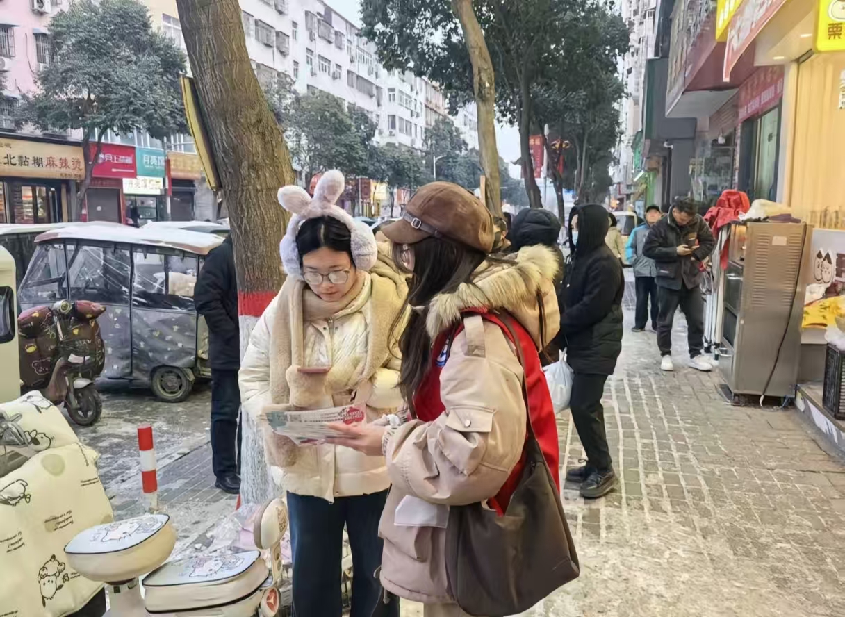 在城区人流密集的街道与商圈周边,实践队员开展了形式多样的文明宣传志愿服务活动。实践队员身着厚实的冬装,佩戴志愿标识,手持文明宣传手册,主动走向过往行人,耐心细致地讲解文明行为规范、消防安全知识、反诈防骗常识等内容。面对市民的疑问,实践队员结合专业知识,用通俗易懂的语言逐一解答,引导大家自觉遵守社会公德,养成文明出行、安全生活的良好习惯。活动过程中,实践队员分工明确、热情饱满,有的主动向老年人讲解反诈技巧,帮助老年群体提高风险防范意识;有的向青少年普及文明上网知识,引导树立正确的网络观;有的向商户宣传诚信经营理念,助力营造良好的市场环境。