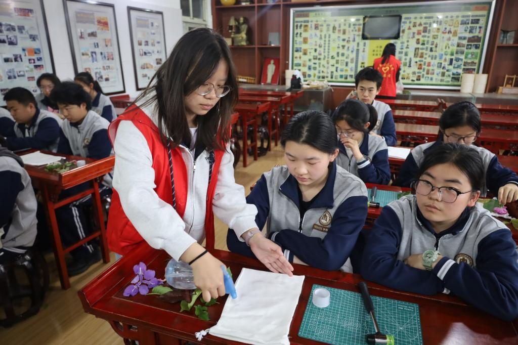 课堂上,志愿者从植物选择、构图布局到拓印技巧逐步讲解演示。同学们认真摆放叶与花,轻轻敲击,随着此起彼落的捶打声,植物的脉络与色彩渐渐清晰地浮现于素布之上,仿佛将春天永远留存。制作过程中,志愿者穿行其间,耐心指导拓印力度与画面构图,在互动中传递技艺之美。