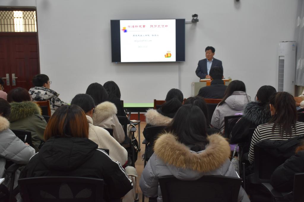 会议伊始,主持人王建阳对张立兴老师作了简要的介绍,并对张立兴的到来表示热烈欢迎。随后,张立兴以“学悟新党史,践历史使命”为主题,围绕新党章重大的历史贡献、新党章鲜明的时代特征、争做合格共产党员三个部分对党章做出了深刻的解读,并着重讲解了新党章鲜明的时代特征,阐述了新党章“新”在何处。最后,张立兴强调新时代青年要强化政治意识和责任担当意识,争做祖国的建设者。