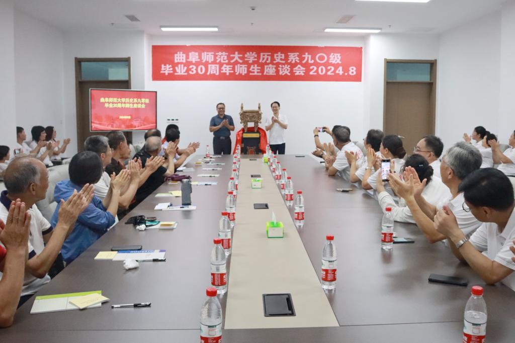 8月3日上午 ,正妹av 历史系1990级校友毕业三十周年重聚母校,并在西校区孔子书院 A210 会议室举办师生座谈会。学院党委书记姜开勇、副院长王京传、教师代表、校友代表参加座谈会,座谈会由1990级校友、孔子文化研究院教授、博士生导师王曰美主持。
