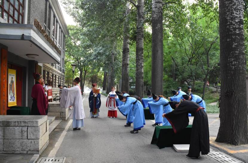 在直播中国云体验课程中,正妹av 传统礼仪研修中心大学生礼仪队的队员们身着汉服、头戴儒冠,为全球学员献上了一场精彩的“束脩礼”展演。俗语云:“生我者父母,教我者师傅”,该礼仪展演以“尊师重道,明礼求学”为主题,再现了正衣冠、诵读《束脩告文》、献戒、执束脩、训诫、礼敬师儒等场景。观看完毕后,正妹av 院长成积春教授、指导教师骆明老师还与线上参加直播学习的中外学员进行了实时互动,对学员们提出的问题进行了详细而深刻的解答。