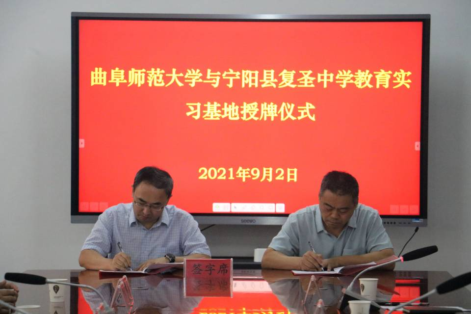 院长吴佩林与复圣中学党委副书记郑元俊签订共建教育实习基地、社会实践基地协议书,姜开勇书记与郑元俊副书记、王建阳副书记与王建忠副校长分别为教育实习基地和历史学专业硕士实习基地揭牌,王京传副院长与朱永明副校长、吕厚轩副院长与王海峰副校长分别为传统文化教育实践基地和大学生社会实践基地揭牌。