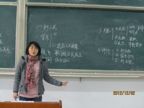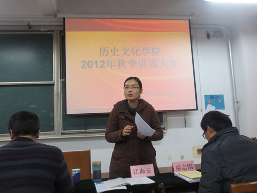决赛当天,经过初赛的角逐闯进决赛的12名选手都有各自的亲友团加油助威,观众们积极参与。选手们采用板书的形式进行现场授课,讲解的课题包括《三民主义》、《甲午中日战争》、《丝绸之路》和《汉字与书法》等高中历史课本中的知识。选手们仪态大方、板书规范、对课程内容掌握娴熟、深入浅出的讲解课程内容,教学形式创新,并与“同学们”积极互动。赛后,江海云老师对选手的表现进行了深刻的点评,首先肯定了同学们的进步,同时也提出了选手们存在的不足,给同学们提供宝贵的意见和建议。